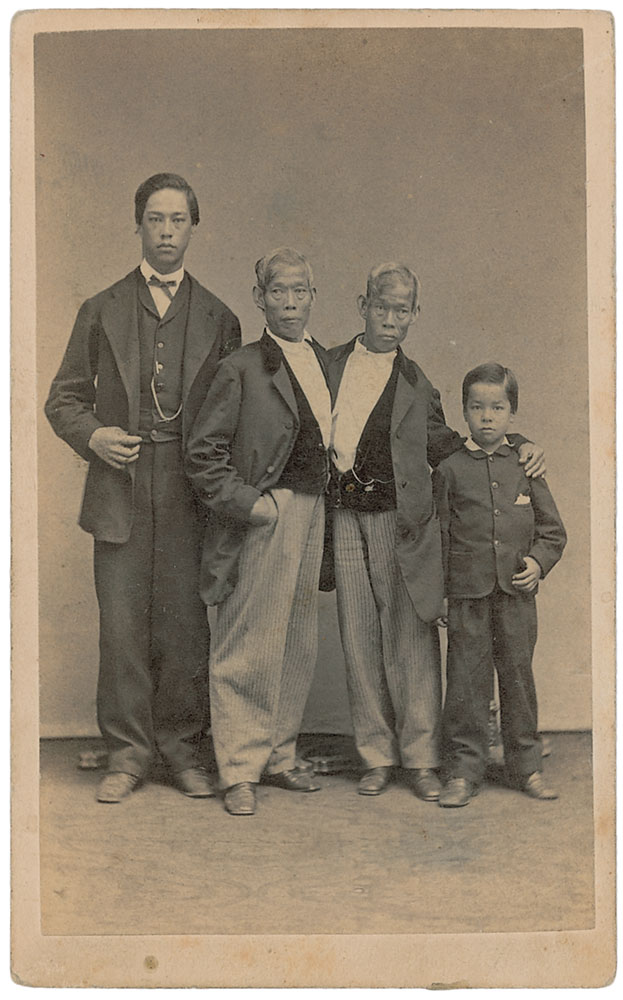 World-famous conjoined twins (1811–1874) born in Siam (now Thailand) from which the phrase 'Siamese twins' is derived. They were discovered by a Scottish merchant and exhibited around the world as a curiosity and made their way to the United States, where they were occasionally promoted by P. T. Barnum but found him stingy. The inseparable brothers eventually left show business and bought a plantation together in North Carolina and joined in matrimonial union with the Yates sisters, with whom they fathered a total of twenty-one children. Unsigned 2.25 x 4 carte-de-visite portrait of Chang and Eng Bunker in between two of their sons, with Chang’s son James on the left and Eng’s son Albert on the right. Published by S. Masury of Boston. In fine condition, with trivial soiling to the mount. Chang and Eng, as well as the photographer, Samuel Masury, all passed away in 1874, and this image was captured some time in the preceding decade. A scarce image of the pair with excellent contrast.