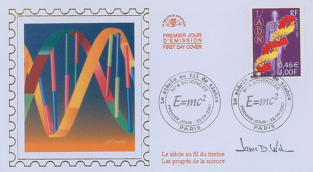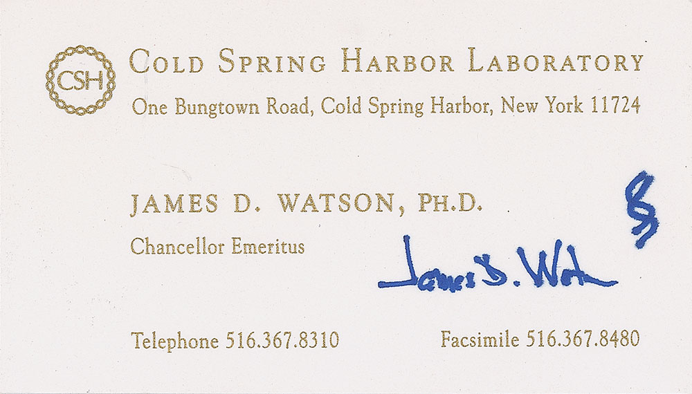 Two items: an ink signature, “James D. Watson,” who adds a small sketch of a double helix on an off-white 3.5 x 2 business card; and an FDC with an affixed cachet depicting a multicolored double helix, signed in black ballpoint. In overall fine condition. Pre-certified PSA/DNA.