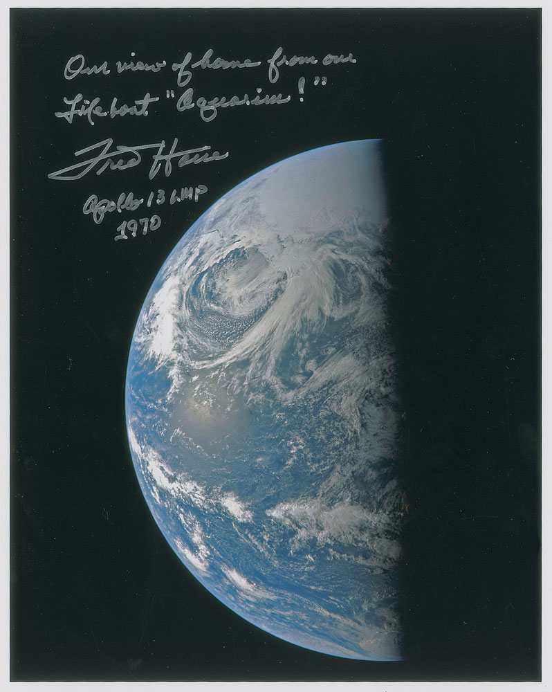 Beautiful color satin-finish 8 x 10 photo of Earth, signed in silver ink, “Our view of home from our Lifeboat ‘Aquarius!’, Fred Haise, Apollo 13 LMP, 1970.” In very fine condition. Pre-certified Zarelli Space Authentication.