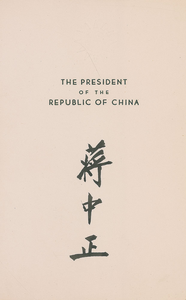 Crisp black ink signature in Chinese on an off-white 3.75 x 5.75 sheet with raised lettering reading, “The President of the Republic of China,” below an embossed sun. In fine condition, with trivial wear to top edge. Pre-certified PSA/DNA.