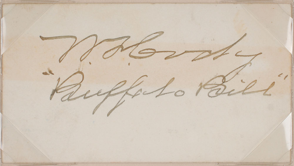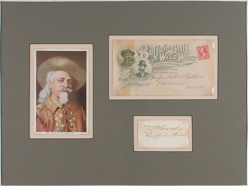 Ink signature, “W. F. Cody, ‘Buffalo Bill’,” on an off-white 3.25 x 1.75 card, with an ornate envelope addressed in Cody's hand, “Miss Nellie Ellis, Woburn, Mass." Matted together beside a color postcard of Cody to an overall size of 16 x 12. In very good condition, with a band of toning passing through the signature. Pre-certified PSA/DNA.