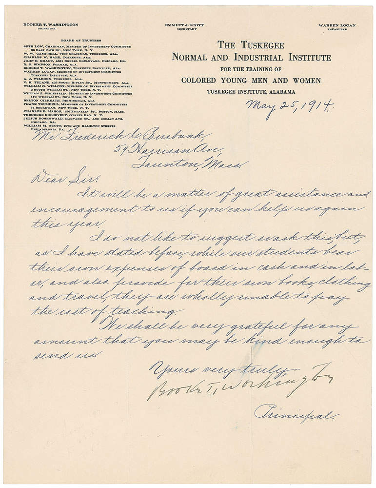 LS, one page, 8.5 x 11, Tuskegee Normal and Industrial Institute letterhead, May 25, 1914. Letter to Frederick Burbank, in part: “I do not like to suggest or ask this, but, as I have stated before, while our students bear their expenses of board in cash and in labor, and also provide for their own books, clothing and travel, they are wholly unable to pay the cost of teaching. We shall be very grateful for any amount that you may be kind enough to send us.” In fine condition, with intersecting folds (passing through a single letter of the signature) and trivial creasing. Pre-certified PSA/DNA.