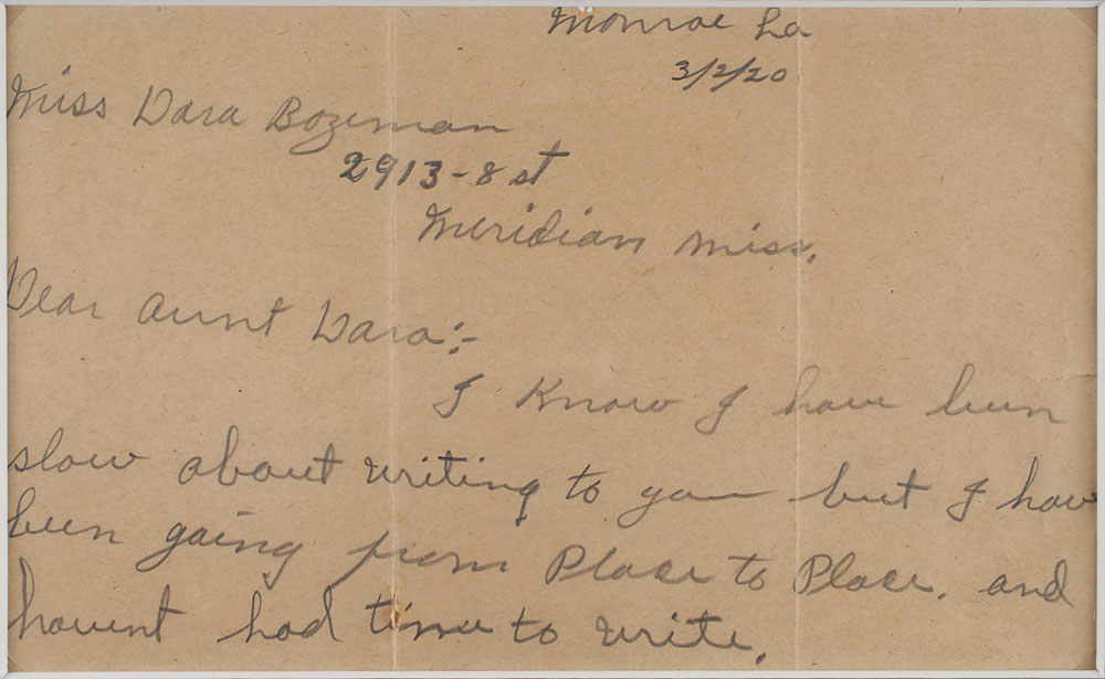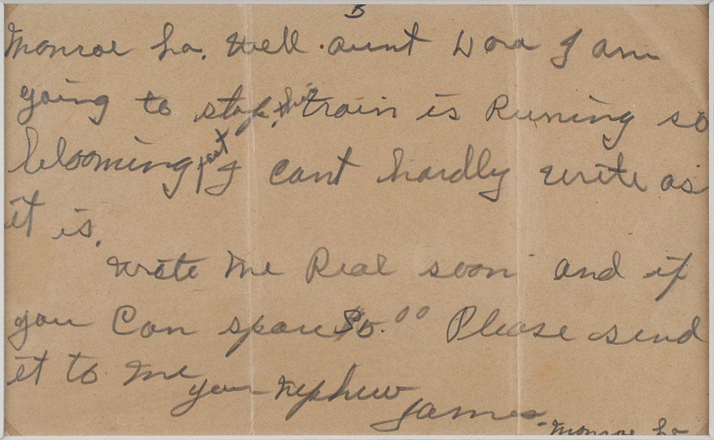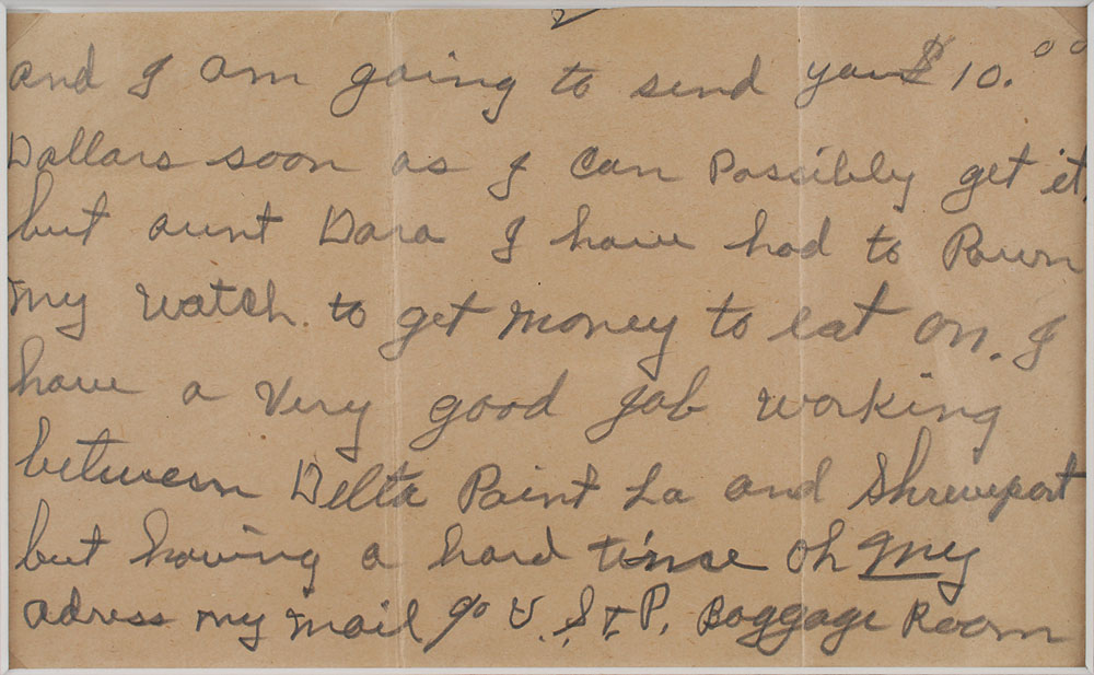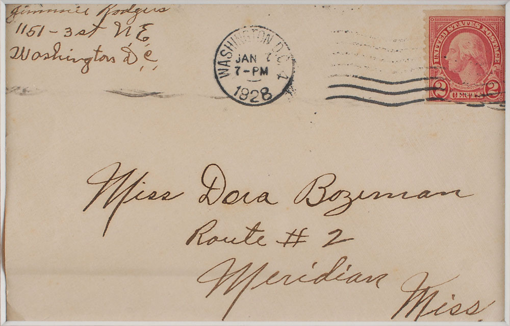 ALS in pencil, signed “James,” three pages, 7.75 x 4.75, March 2, 1920. Letter to his aunt, Dara Bozeman. In part: "I know I have been slow about writing to you but I have been going from place to place, and haven’t had time to write, and I am going to send your $10.00 dollars soon as I can possibly get it, but aunt Dara I have had to pawn my watch to get money to eat on. I have a very good job working between Delta Point La and Shreveport but having a hard time oh my…well aunt Dara I am going to stop, this train is running so blooming fast I cant hardly write as it is. Write me real soon and if you can spare $5.00 please send it to me.” Includes an original mailing envelope from a different letter to his aunt, postmarked January 2, 1928, with the primary address in another hand but return address written by Rodgers, incorporating his full name, “Jimmie Rodgers.” Suede-matted and framed with an album cover to an overall size of 22.25 x 22.25. Two vertical folds (one passing through the last letter of the signature), a small tear to the bottom of the first page, and a few creases, otherwise fine condition. Pre-certified PSA/DNA.