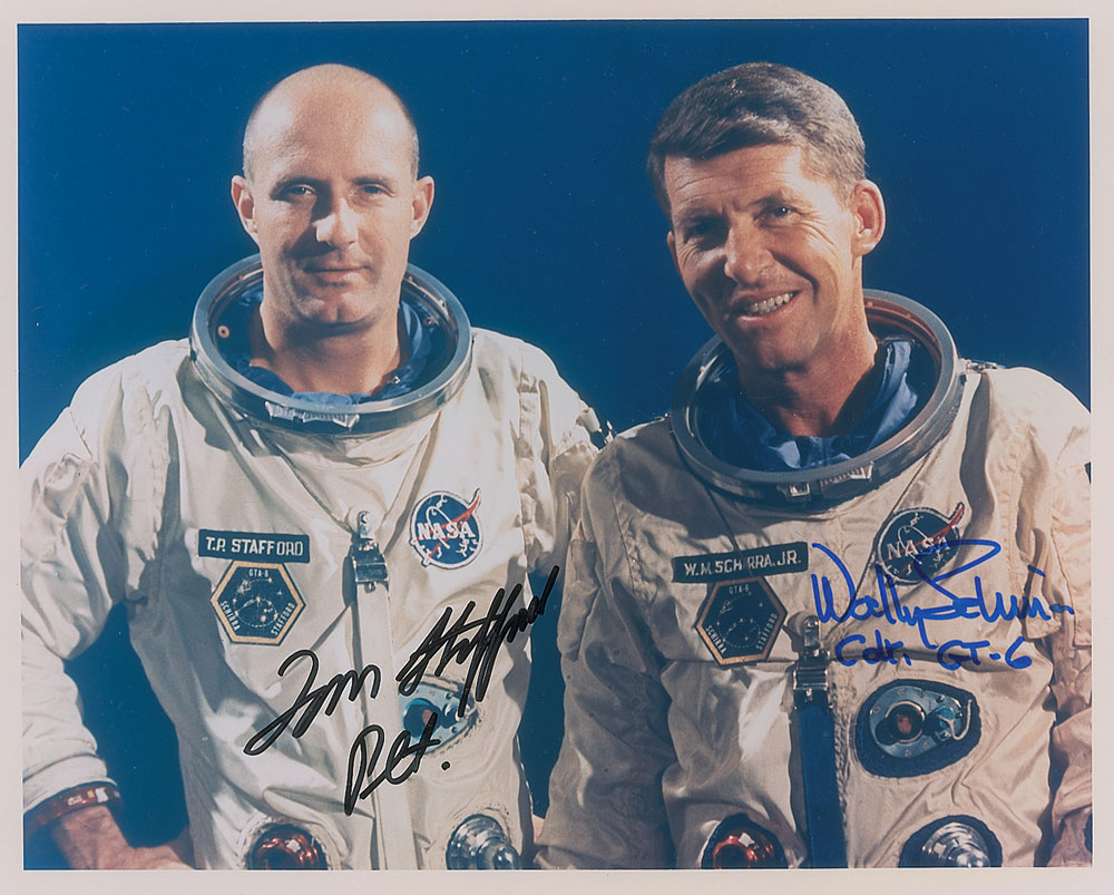 Color satin-finish 10 x 8 photo of the crew of Gemini 6, signed in black felt tip, “Tom Stafford, Plt.” and “Wally Schirra, Cdr. GT–6.” In fine condition. From the Leon Ford Collection. Pre-certified Zarelli Space Authentication.