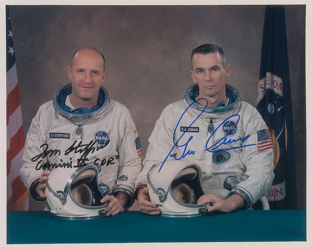 Color satin-finish 10 x 8 photo of the crew of Gemini 9 in their white space suits, signed in black felt tip, “Tom Stafford, Gemini IX CDR,” and in blue felt tip, “Gene Cernan.” In fine condition, with a slightly trimmed top edge. From the Leon Ford Collection. Pre-certified Zarelli Space Authentication.