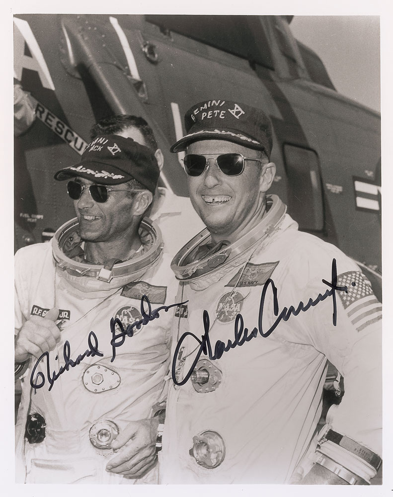 Glossy 8 x 10 photo of the Gemini 11 crew after mission recovery, signed in black felt tip by Richard Gordon and Charles Conrad. In fine condition. From the Leon Ford Collection. Pre-certified Zarelli Space Authentication.