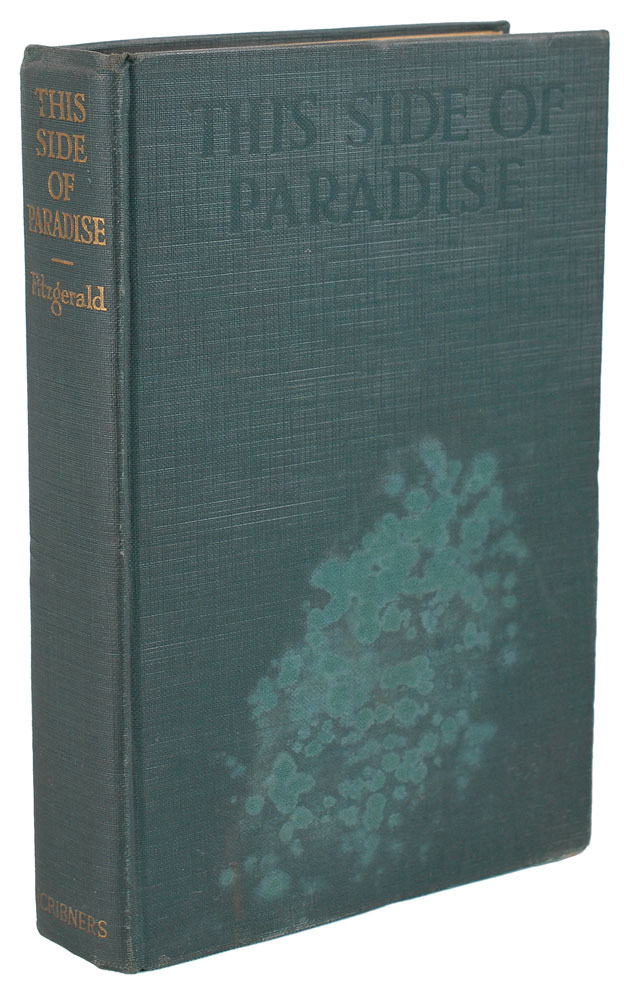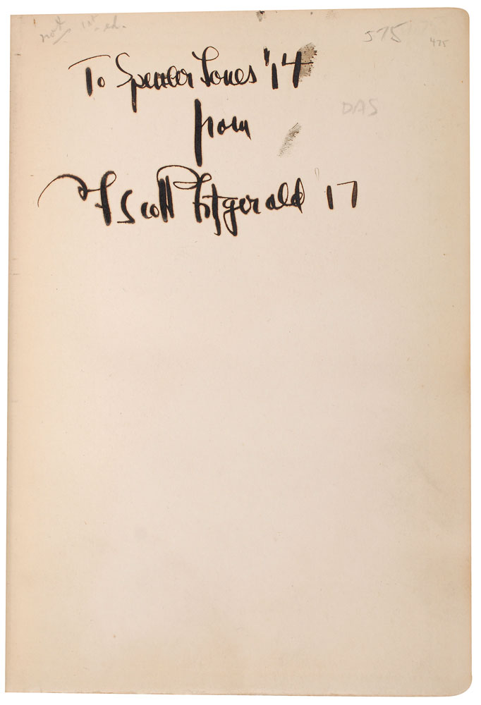 Signed book: This Side of Paradise. Later printing. NY: Charles Scribner's Sons, 1920. Hardcover, 5.25 x 7.75, 305 pages. Signed and inscribed on the first free end page in bold fountain pen, “To Spencer Jones ’14, from F. Scott Fitzgerald ’17.” Autographic condition: fine. Book condition: VG-/None. Though Fitzgerald did not complete his studies and graduate with the class of 1917, his years at Princeton permanently shaped his life and career. It was in this world of privilege that he devoted himself to finding his voice as a writer, and there that he met the people who would later reappear as characters in his novels—most notably Ginevra King, the muse behind many of his female characters, including Daisy Buchanan. In 1919, Fitzgerald completed and successfully pitched This Side of Paradise to Scribners; integrating 80 pages of an unpublished novel he had written while at Princeton, and telling the tale of an attractive Princeton student—certainly based on himself—the novel is inseparable from his university years. Inscribed to a fellow Princeton classmate, this is a fantastic association piece. Pre-certified PSA/DNA.