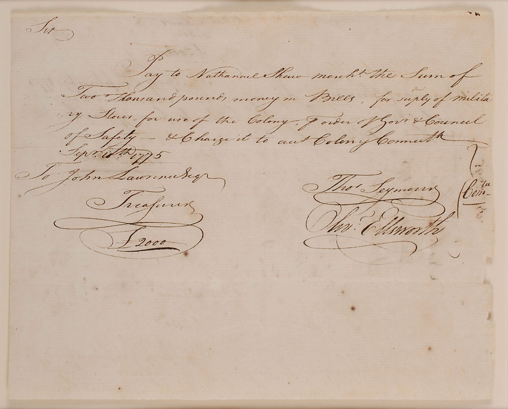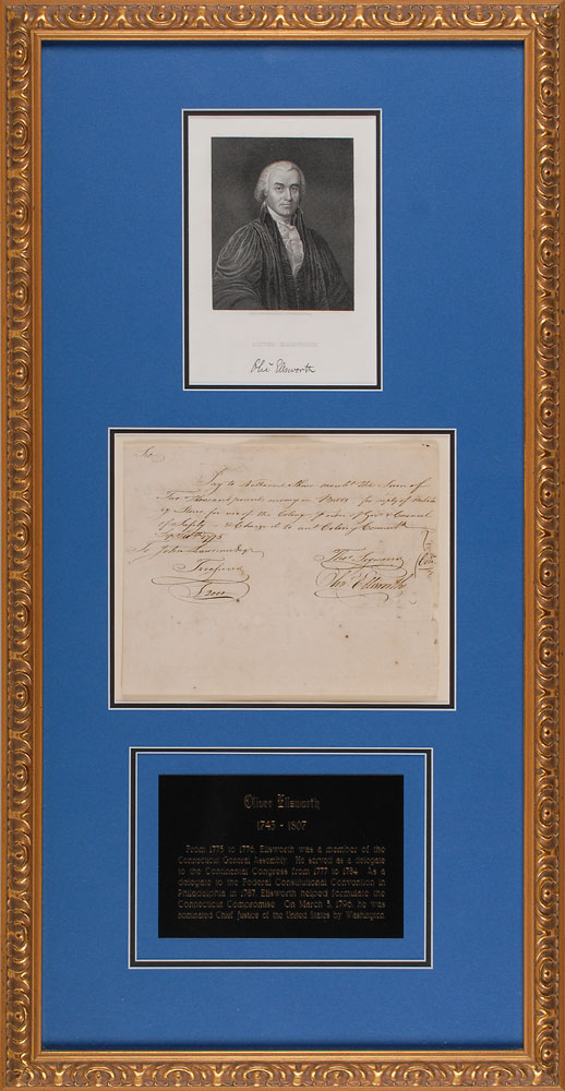 Third chief justice of the United States (1745–1807) and delegate to the Constitutional Congress who later submitted the amendments which became the Bill of Rights. Revolutionary War–dated manuscript DS, signed “Oliv’r Ellsworth,” one page, 7.75 x 6, September 10, 1775. Pay order addressed to Treasurer John Lawrence. In part: “Pay to Nathaniel Shaw Mercht the Sum of Two thousand pounds money in Bills, for supply of Militia of stores for use of the Colony.” Signed at the conclusion by Oliver Ellsworth and Thomas Seymour. Expertly mounted, double-matted, and framed with a plaque and an engraved portrait to an overall size of 13.75 x 26.75. In fine condition, with intersecting folds (one vertical fold passing through a single letter of the signature), a few edge chips, and some show-through from docketing to reverse. Pre-certified PSA/DNA.