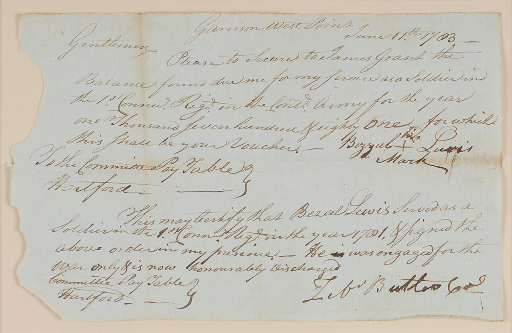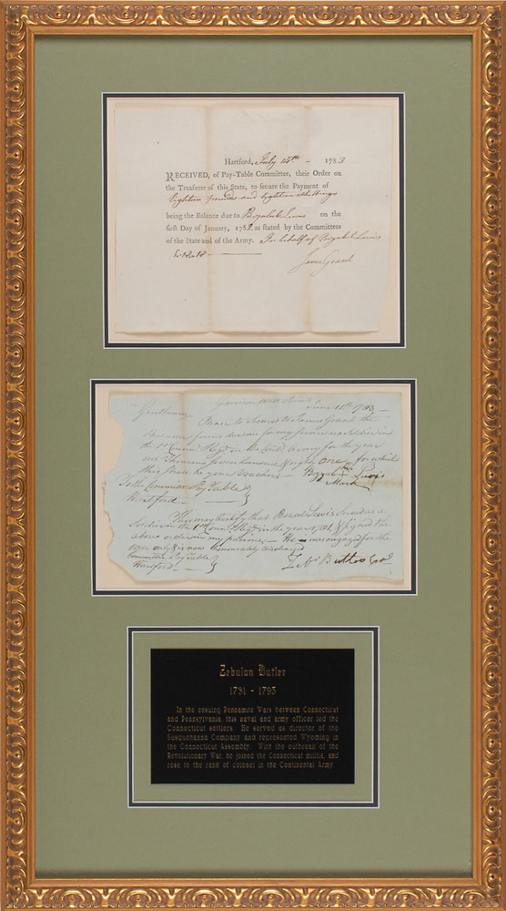 Soldier and politician (1731–1785) who served in the Connecticut Assembly and commanded the garrison of Forty Fort in the Wyoming Valley during the Revolutionary War. Revolutionary War–dated manuscript DS, signed “Zeb’n Butler Col.,” one page, 8.75 x 5.5, June 11, 1783. Butler certifies a pay request for a soldier in the Continental Army, in part: “This may certify that Buzel Lewis served as a Soldier in the 1st Connect. Regt. in the year 1781 & signed the above order in my presence—He was engaged for the war only & is now honourably discharged.” Signed at the conclusion by Butler. Includes the subsequent partly-printed payment receipt, July 14, 1783, signed by James Grant on the behalf of Lewis. Mounted, double-matted, and framed to an overall size of 15 x 27. Intersecting folds, scattered soiling, and paper loss to left edge, otherwise fine condition. Pre-certified PSA/DNA.