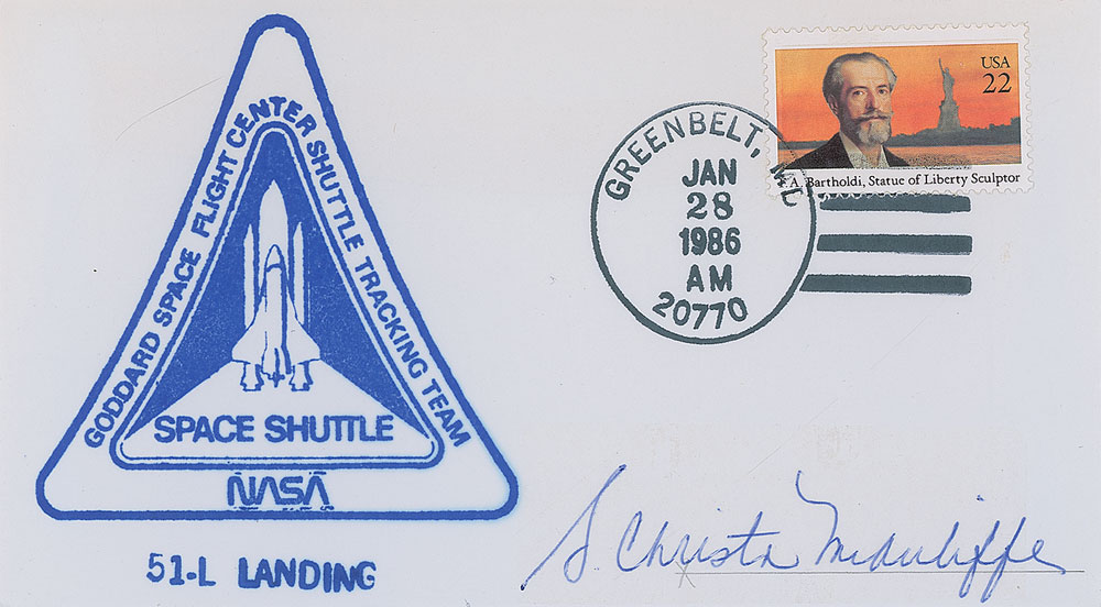 Challenger STS-51-L launch day postal cover with a stamped cachet honoring the tragic mission, signed in blue ballpoint, “S. Christa McAuliffe.” In fine condition. Pre-certified Zarelli Space Authentication.