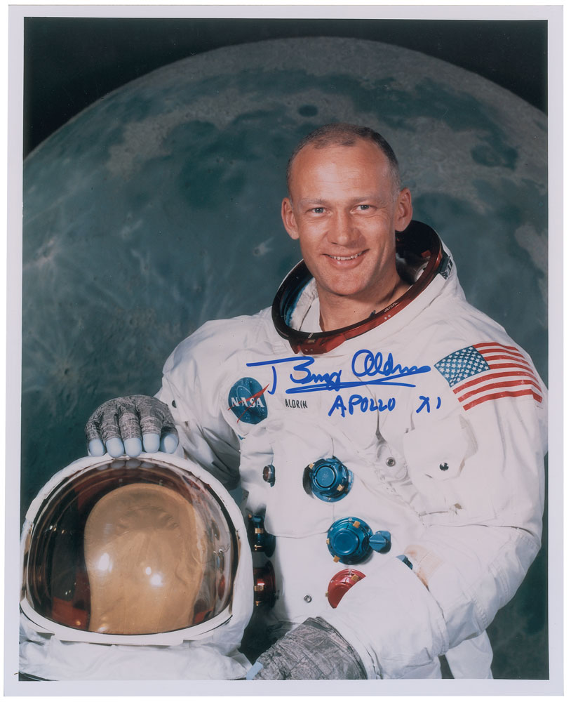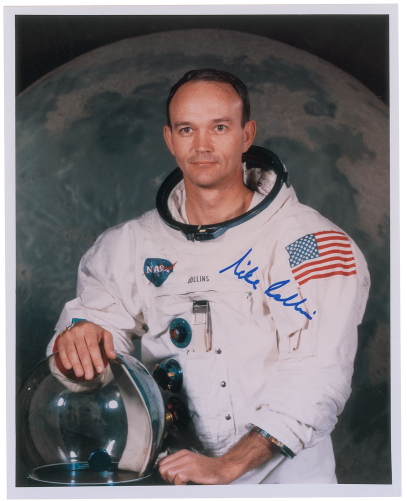Three 8 x 10 photos: an official color NASA lithograph of Armstrong in his white space suit, signed and inscribed in blue felt tip, “To J…Neil Armstrong”; a satin-finish photo of Aldrin in his white space suit, signed in blue felt tip, “Buzz Aldrin Apollo XI”; and a satin-finish photo of Collins in his white space suit, signed in blue felt tip, “Michael Collins.” In overall very good to fine condition, with scattered creases to the Armstrong lithograph and the name in Armstrong’s inscription struck out in black felt tip. Pre-certified Zarelli Space Authentication.