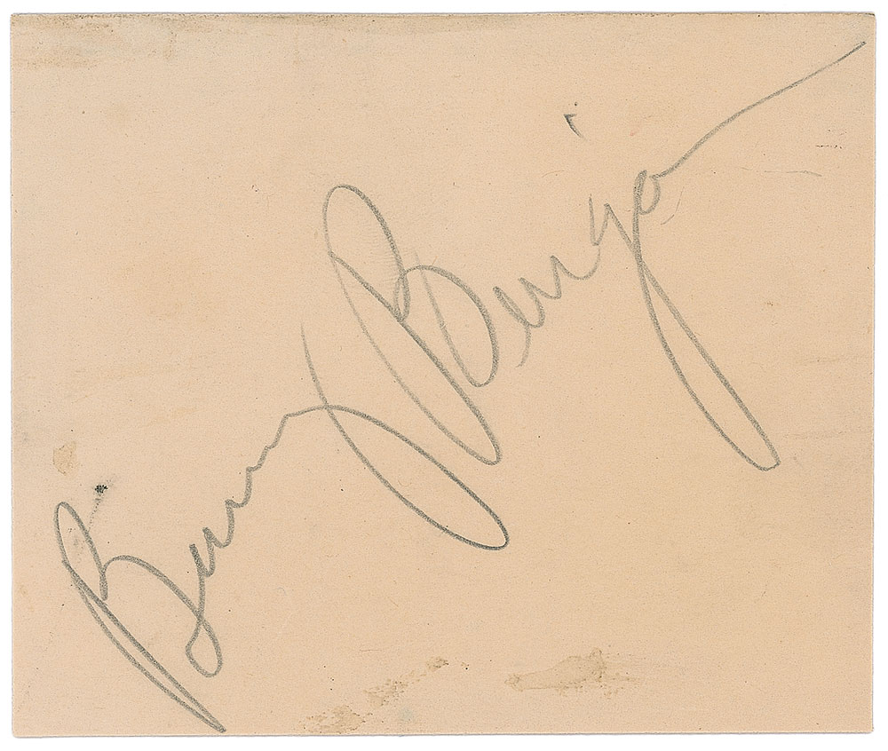Jazz trumpeter (1908–1942) who rose to stardom during the swing era, but was hampered by alcoholism until it drove him to death at age 33. Pencil signature, “Bunny Berigan,” on an off-white 3.25 x 2.75 slip. Light scattered soiling, otherwise fine condition. Pre-certified PSA/DNA.