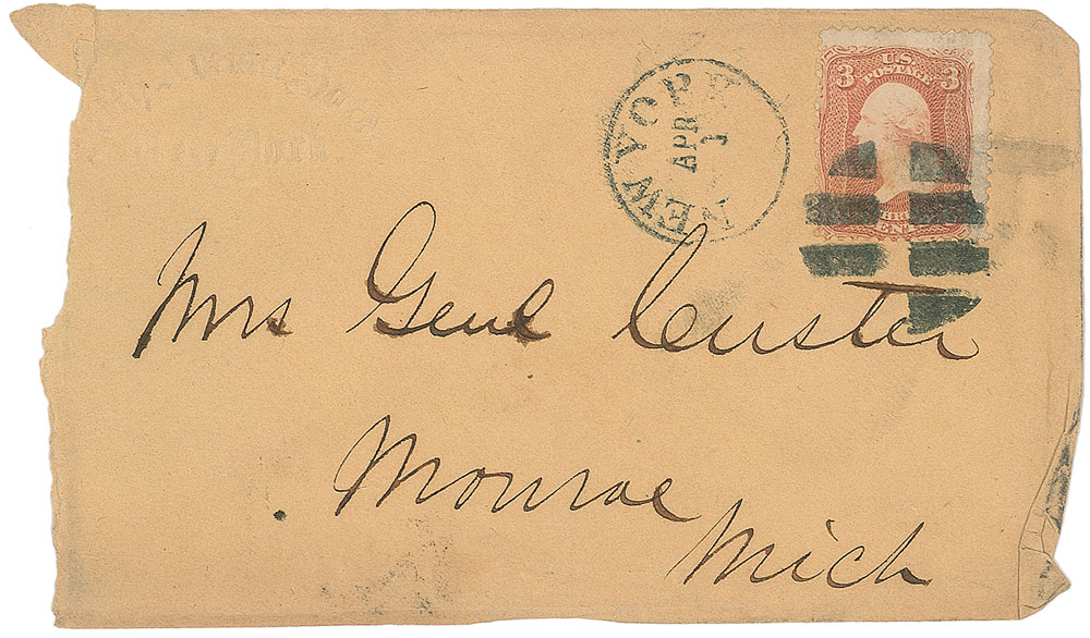 Hand-addressed mailing envelope, 5.25 x 3, addressed by Custer to his wife, “Mrs. Genl. Custer, Monroe, Mich,” bearing an affixed three-cent postage stamp and postmarked New York, April. In very good condition, with a torn left edge from opening, light creasing and soiling, and slight spreading to the writing (the postmark stamps trivially affecting two letters). Pre-certified PSA/DNA.