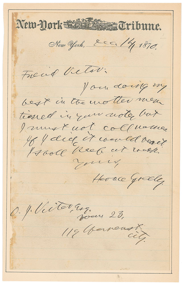 ALS, one page, lightly-lined, 4.75 x 7.75, New York Tribune stationery, December 14, 1870. Letter to O. I. Vitor, in part: “I am doing my best in the matter…but I must not call names.” Affixed along the left edge to a slightly larger sheet. Chipping and toning to left edge, and scattered soiling, otherwise fine condition. Accompanied by an engraved portrait of Greeley bearing a pre-printed facsimile signature. Pre-certified PSA/DNA.