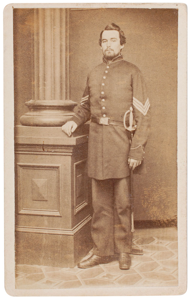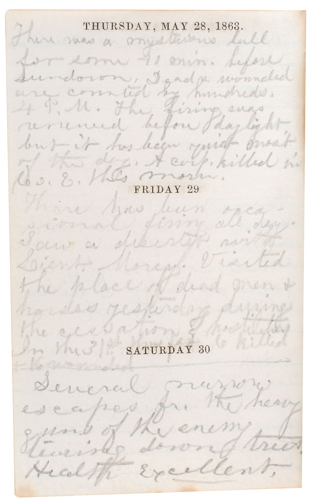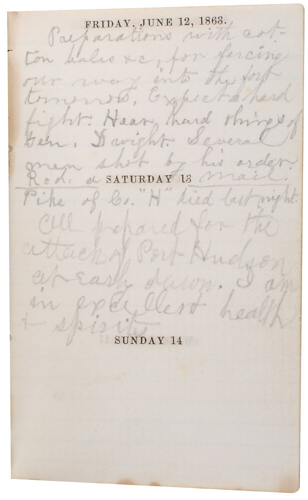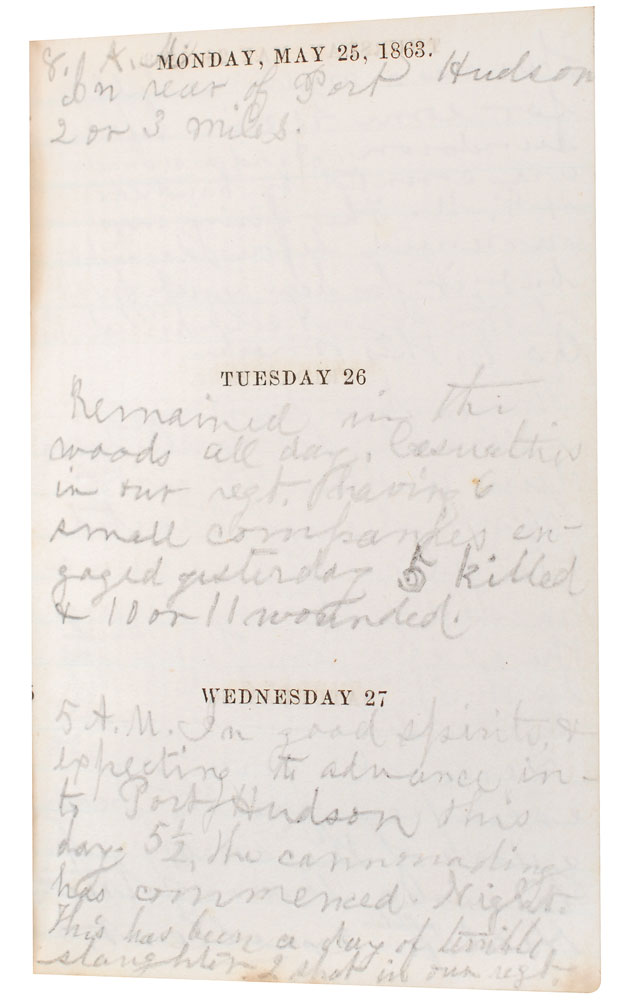 Personal leatherbound 1863 diary of Sgt. Francis A. Clary, 2.5 x 4, signed on the first page in ink, “F. A. Clary.” The diary contains terse entries penned almost daily from January 1 through April 13, and May 24 through June 13, the day before Clary was killed in action at the Battle of Port Hudson. The diary begins in a calm state, the entry of January 1 reading, “Mild & balmy are these Southern skies…Read’g ‘Nicholas Nickelby.’” By the middle of the month things had changed, with Clary writing on the 16th and 17th, “Is bitter cold, with a piercing merciless wind…All preparing to leave for action up the river.” After a “narrow escape from a boiler explosion,” Clary describes a Sunday in mid-February, “Had a miserable drill. Came in on the ‘double quick.’ Sacred time seems to be of little acct. now!” On March 13, he writes, “We commence our Grand Expedition toward Port Hudson.” The next day, “Marched 7 miles last night, & 10 more to day. Are now about 5 m. fr. Port Hudson…Hear the firing at Port Hudson distinctly. Occupy ground just deserted by the rebels.” On April 12, “Moved up a short distance from Pattersonville. Shelled a post of rebel cavalry & at 5 P.M. engaged a rebel battery. Fight lasted 35 min. Were driven back. A piece of shell struck only 2 ft. fr. me.” The fiercest fighting begins on May 27, “The cannonading has commenced…This has been a day of terrible slaughter. 2 shot in our regt.” On May 28, he gravely observes, “Dead and wounded are counted by hundreds.” On the 30th, he writes, “Several narrow escapes from the heavy guns of the enemy tearing down trees.” His last entry comes on June 13, “All prepared for the attack of Port Hudson at early dawn. I am in excellent health & spirits.” A pocket in the pack of the diary contains several clippings of inspirational texts. Also includes two full-length carte-de-visite portraits of Clary, one in a small frame, as well as a newspaper clipping mentioning his death. In overall fine condition. An outstanding firsthand account of a soldier’s journey during the Civil War.