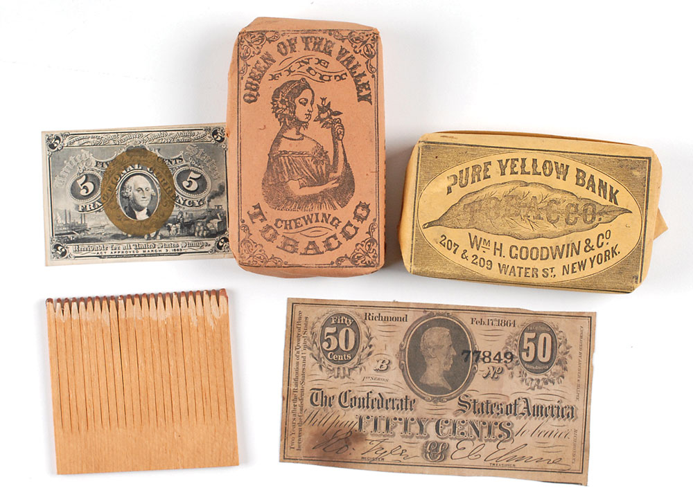 Five Civil War–era items, including: a package of Pure Yellow Bank tobacco from W. H. Goodwin & Co. in its original wrapper; a package of Queen of the Valley fine cut chewing tobacco from J. W. Loomis in its original wrapper; a set of unused matches; an 1863 five-cent US fractional currency note; and an 1864 fifty-cent Confederate note. In overall very good to fine condition.