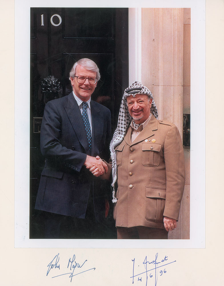 Color glossy 8.25 x 10.75 photo of Major and Arafat posing together, affixed along the top edge to its original 9.75 x 12.5 mount, signed on the mount in black ink, “John Major,” and in blue ink, “Y. Arafat, 4/6/96.” Reverse of the photo bears an Associated Press copyright stamp, and an Associated Press caption sheet is affixed to the reverse of the mount. In fine condition, with trivial surface impressions to photo, and a small spot of dampstaining to the first letter of the Major signature. Arafat met with Major during a two-day visit in early June of 1996 to express his concerns on the Middle East peace process. Pre-certified PSA/DNA.