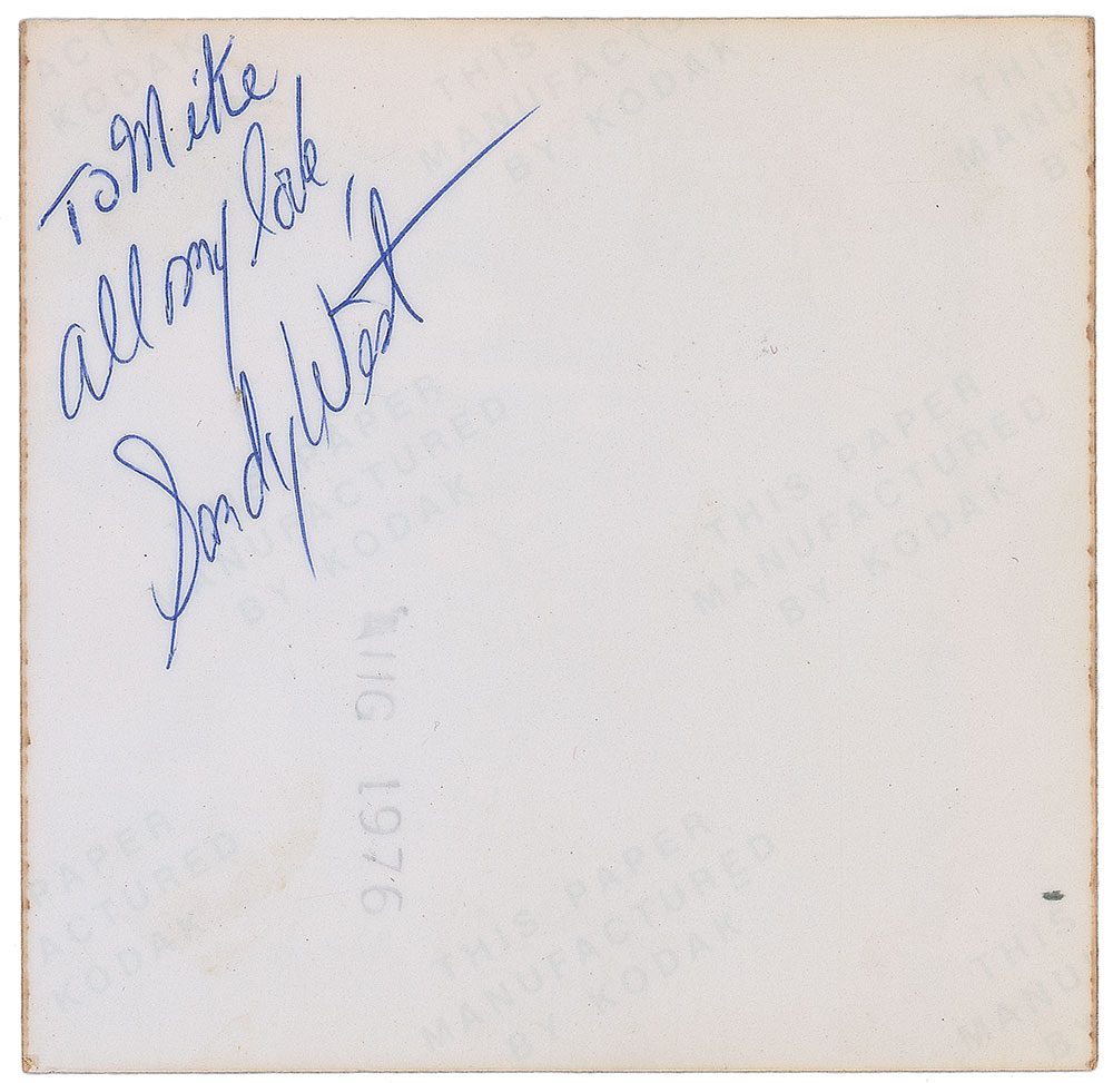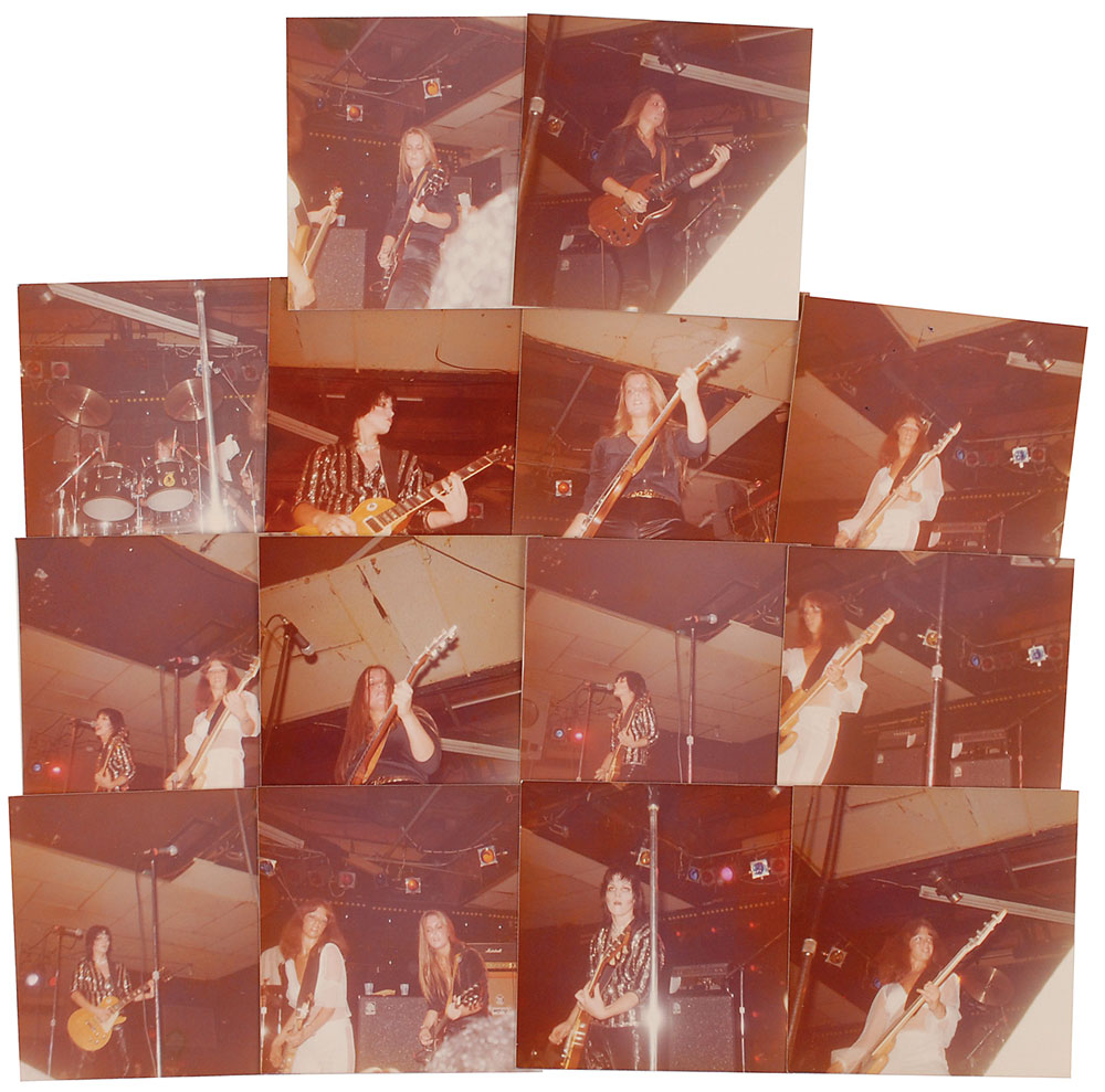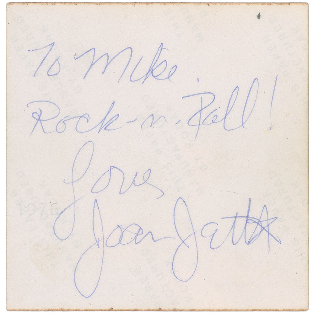 Desirable collection of fourteen first-generation color satin-finish candid photos of The Runaways taken during a performance at Cleveland’s Agora Ballroom in July 1976, each approximately 3.25 x 3.5, four signed and inscribed on the reverse in ballpoint by the musician pictured, “To Mike, Rock-n-Roll! Love, Joan Jett,” “To Mike, All my love, Sandy West,” “Mike, Get a new picture! I look awful here! If you do get a new one, send it to me! Love, Jackie Fox,” and “Lita Ford.” In overall fine condition, with trivial toning and the Jett signature a shade light. Pre-certified REAL.