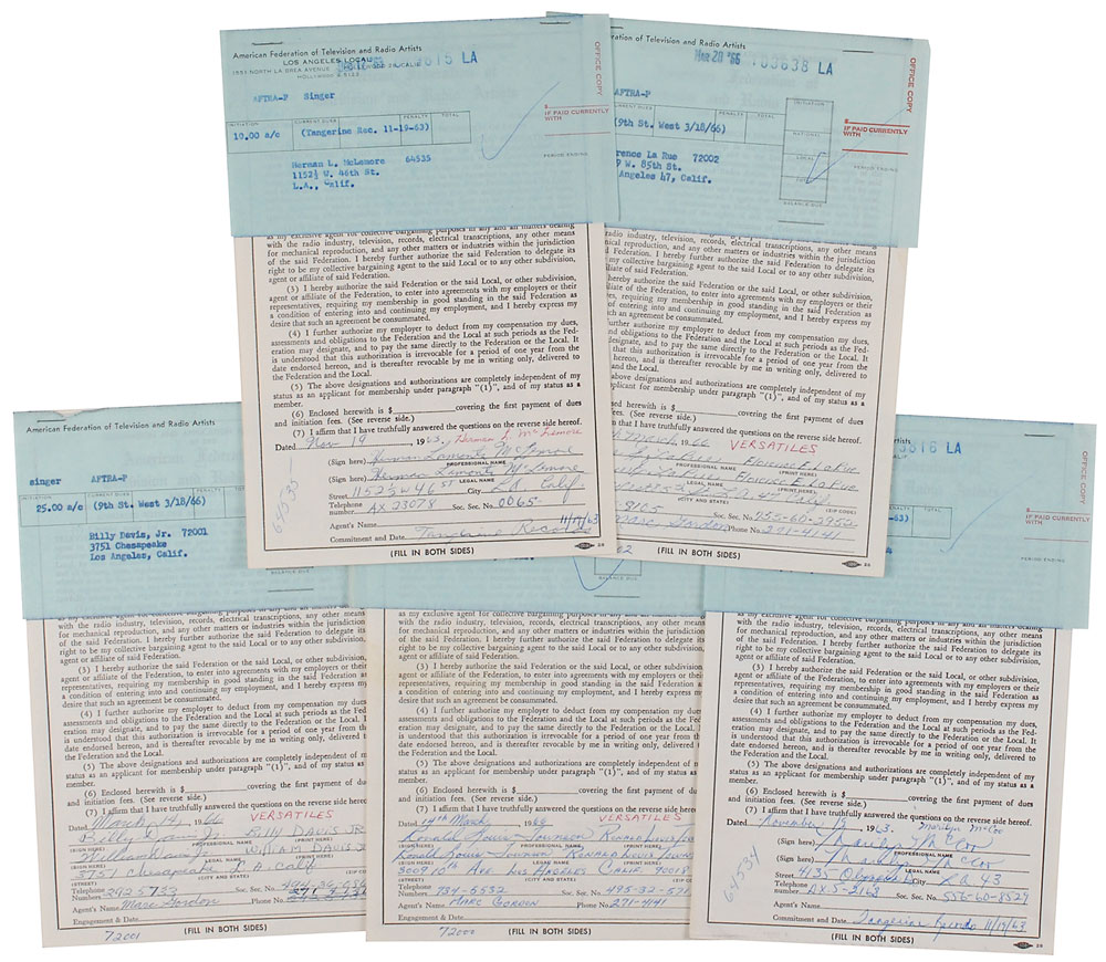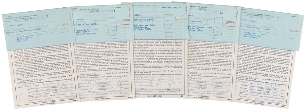 Five standard AFTRA membership applications, signed by Florence LaRue, Billy Davis, Jr., Ron Townson, Marilyn McCoo, and Lamonte McLemore, each one page both sides, 6 x 8.75, dated between 1963 and 1966. Representing the five original members, these early documents identify the band as ‘The Versatiles’ rather than their soon-to-be moniker The 5th Dimension. In overall fine condition, with expected document wear. Pre-certified REAL.