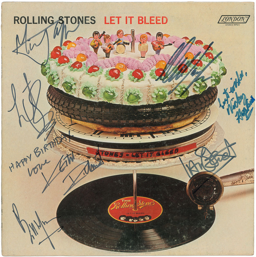 Let It Bleed album signed boldly on the front cover in felt tip by Mick Jagger, Bill Wyman, Mick Taylor, Charlie Watts, and Keith Richards, who adds, “Happy Birthday, Love.” Also signed by keyboard players Ian Stewart and Nicky Hopkins, who adds “Best Wishes.” In fine condition, with some light edgewear and trivial rubbing to lower portion, in no way affecting the signatures. The record is not included. A superb example of the Stones’ tenth full-length release, signed by a remarkable seven band members. Pre-certified REAL.