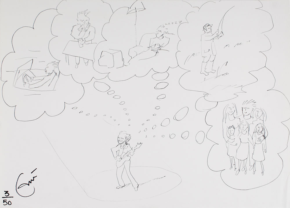 Rare limited edition 16.5 x 11.75 lithograph of Clapton’s artwork for the What Are You Like exhibition, showing Clapton on stage daydreaming of some of his favorite things, numbered 3/50, signed in the lower left in black felt tip. In fine condition, with slight creasing and dings to corners. Pre-certified REAL.