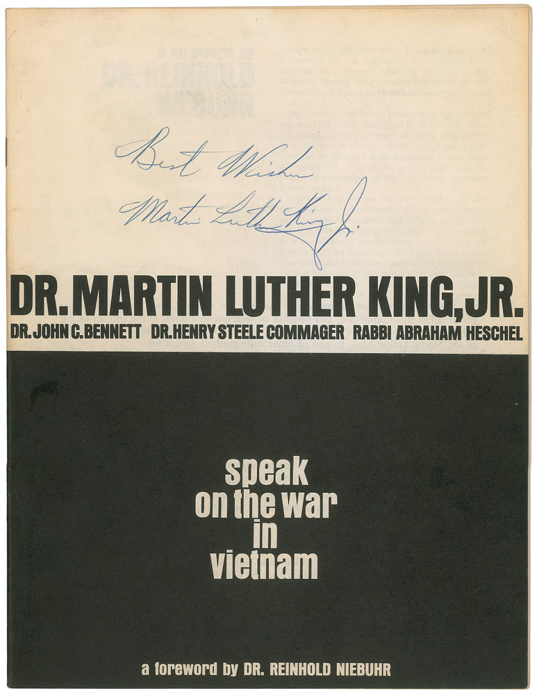 Publication by the Clergy and Laymen Concerned About Vietnam, entitled ‘Speak on the War in Vietnam,’ thirty pages, 8.25 x 10.75, April 1967, signed on the cover in blue ballpoint, “Best Wishes, Martin Luther King, Jr.” The booklet contains two of King’s speeches on the war, including ‘The Casualties of the War in Vietnam,’ given at The Nation Institute in Los Angeles on February 25, 1967, and ‘Beyond Vietnam,’ given at Riverside Church on April 4. Also includes addresses given by several other figures at the April 4 event and a transcript of the subsequent question and answer session. Additional material published in the booklet includes a New York Times interview with King and his comments on the NAACP resolution of April 12, 1967. In fine condition, with edge toning and mild soiling to covers. King’s ‘Beyond Vietnam’ was one of his most important addresses and also one of his most controversial—he opposed the war but remained quiet about it until this point, fearing that involving himself in international affairs would interfere with civil rights progress on the domestic front. An extraordinary signed piece from one of the most tumultuous periods in American history. From the collection of Warren Arthur ‘Chip’ Logan. Pre-certified PSA/DNA.