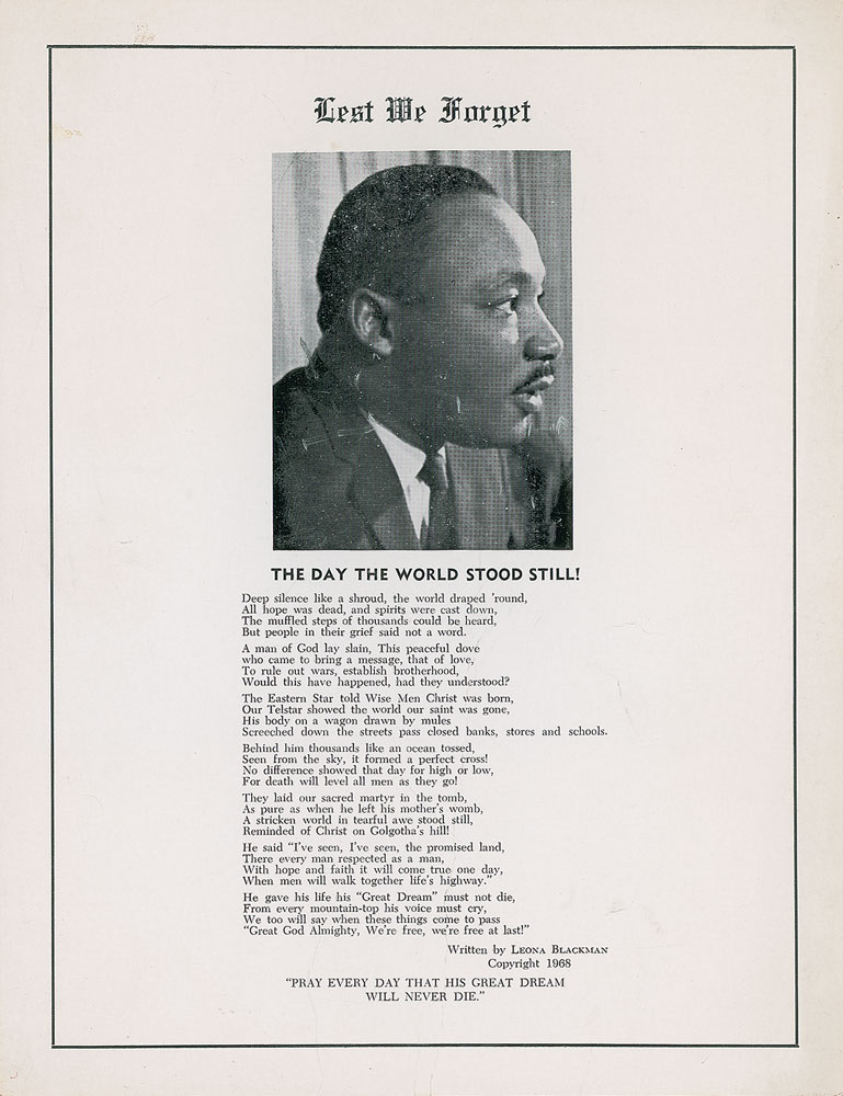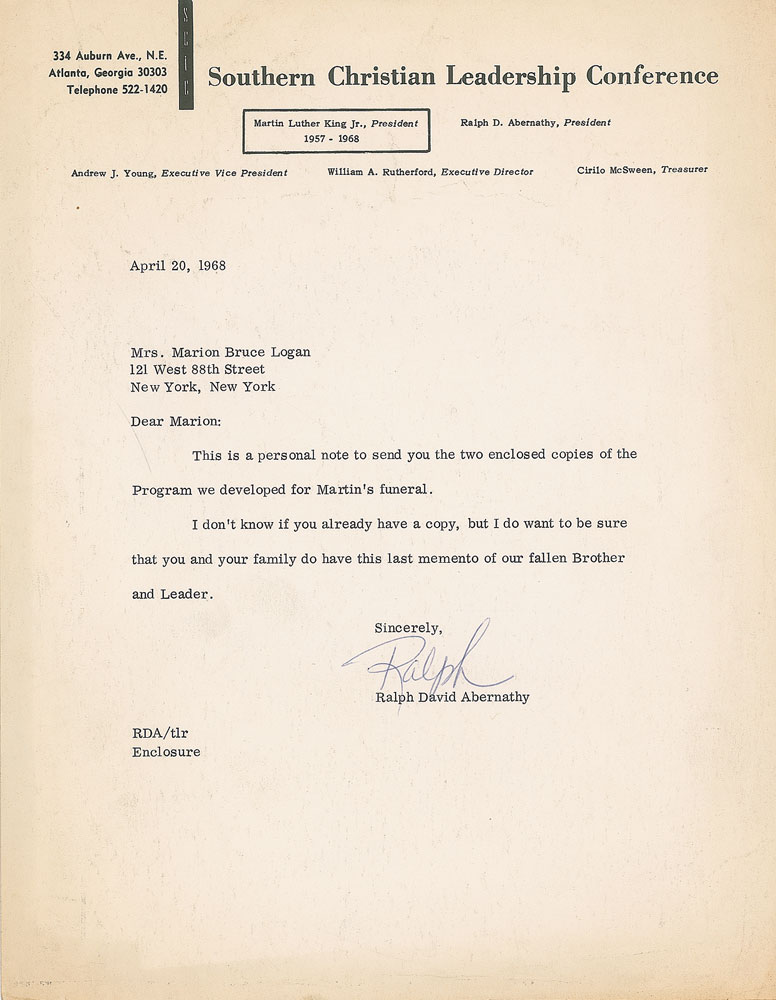 TLS signed “Ralph,” one page, 8.5 x 11, Southern Christian Leadership Conference letterhead, April 20, 1968. Letter to Marian Bruce Logan, in full: “This is a personal note to send you the two enclosed copies of the Program we developed for Martin’s funeral. I don’t know if you already have a copy, but I do want to be sure that you and your family do have this last memento of our fallen Brother and Leader.” In fine condition, with slight creasing and toning (primarily to edges and upper portion). Accompanied by one of the referenced programs. From the collection of Warren Arthur ‘Chip’ Logan. Pre-certified PSA/DNA.
