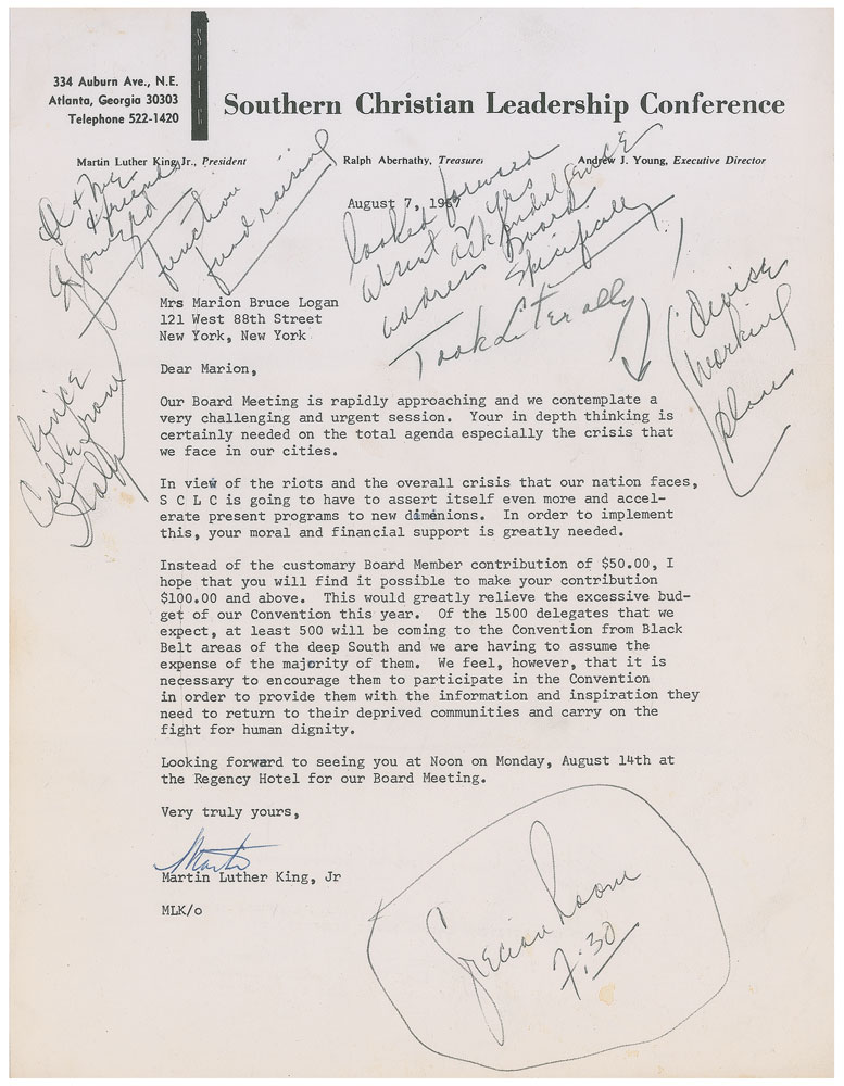 TLS signed “Martin,” one page, 8.5 x 11, Southern Christian Leadership Conference letterhead, August 7, 1967. Letter to Marian Bruce Logan. In part: “Our Board Meeting is approaching and we contemplate a very challenging and urgent session. Your in depth thinking is certainly needed on the total agenda especially the crisis that we face in our cities. In view of the riots and the overall crisis that our nation faces, SCLC is going to have to assert itself even more and accelerate present programs to new dimensions. In order to implement this, your moral and financial support is greatly needed…Of the 1500 delegates that we expect, at least 500 will be coming to the Convention from Black Belt areas of the deep South and we are having to assume the expense of the majority of them. We feel, however, that it is necessary to encourage them to participate in the Convention in order to provide them with the information and inspiration they need to return to their deprived communities and carry on the fight for human dignity.” Bruce added several pencil and ballpoint notations to the margins. In fine condition, with mild creases and a few trivial stains. From the collection of Warren Arthur ‘Chip’ Logan.