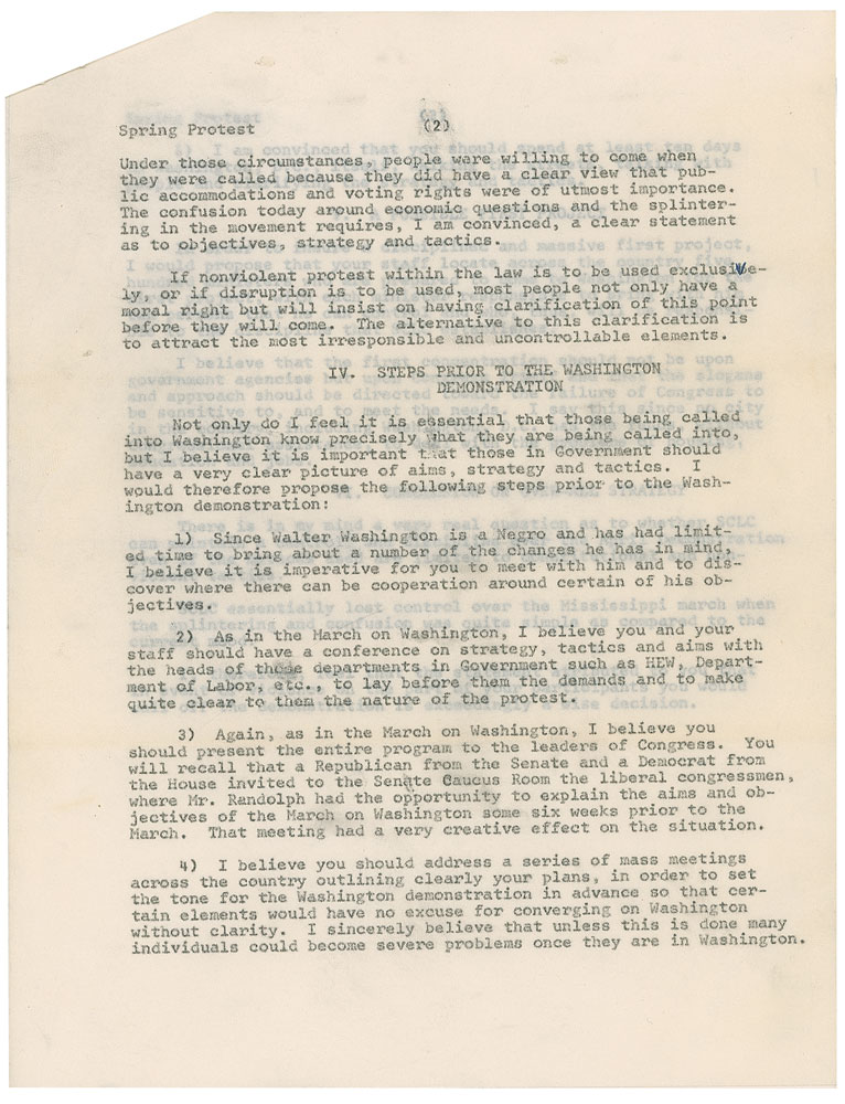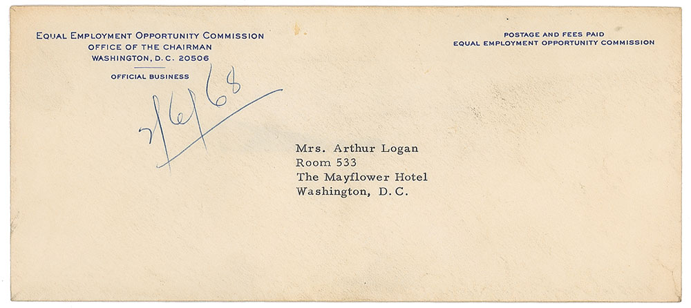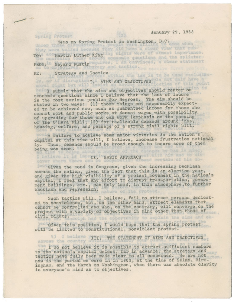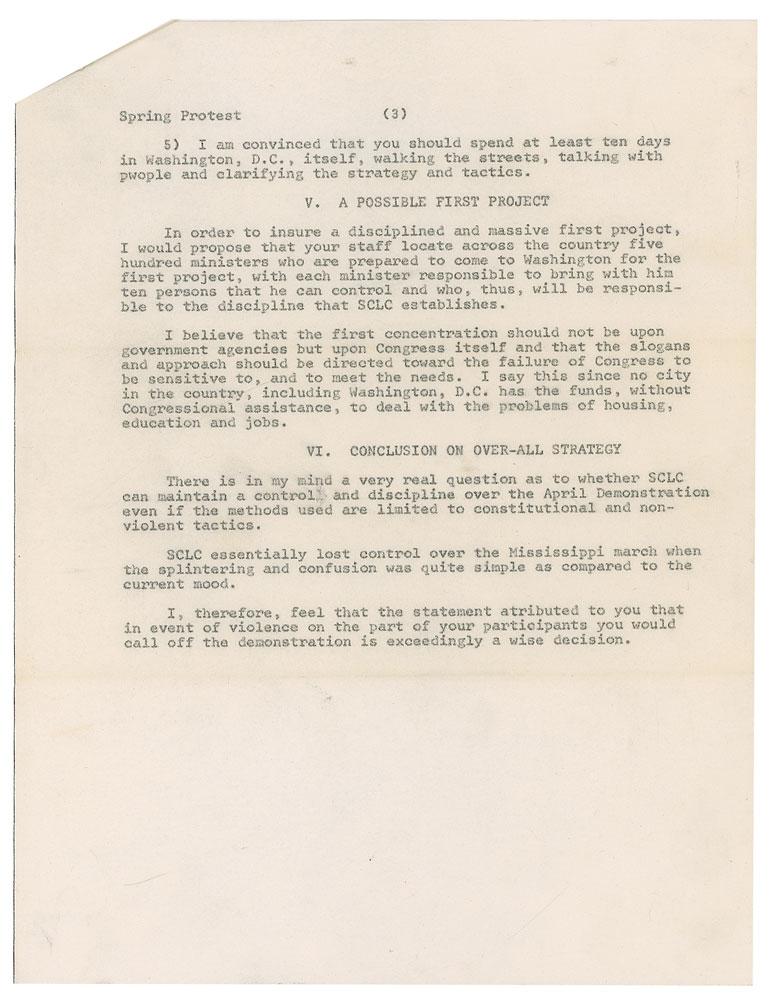Typed memo, unsigned, three pages, 8.5 x 11, January 29, 1968. Carbon copy of a memo from King to Bayard Rustin, sent to Marian Bruce Logan, headed, “Memo on Spring Protest in Washington, D.C.” In part: “I submit that the aims and objectives should center on economic questions since I believe that the lack of income is the most serious problem for Negroes…A failure to achieve some major victories in the nation’s capital at this time will, I believe, increase frustration nationally. Thus, demands should be broad enough to insure some of them being won soon.” In fine condition, with expected document wear. Accompanied by the original mailing envelope. From the collection of Warren Arthur ‘Chip’ Logan.