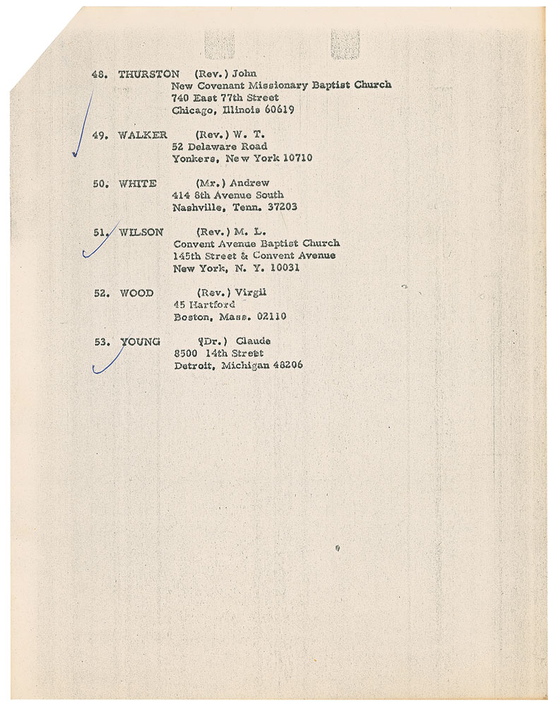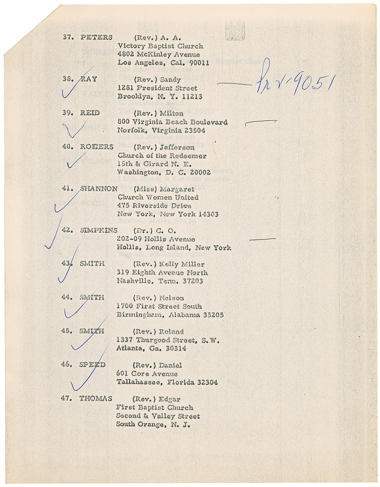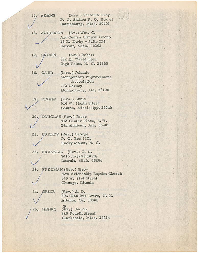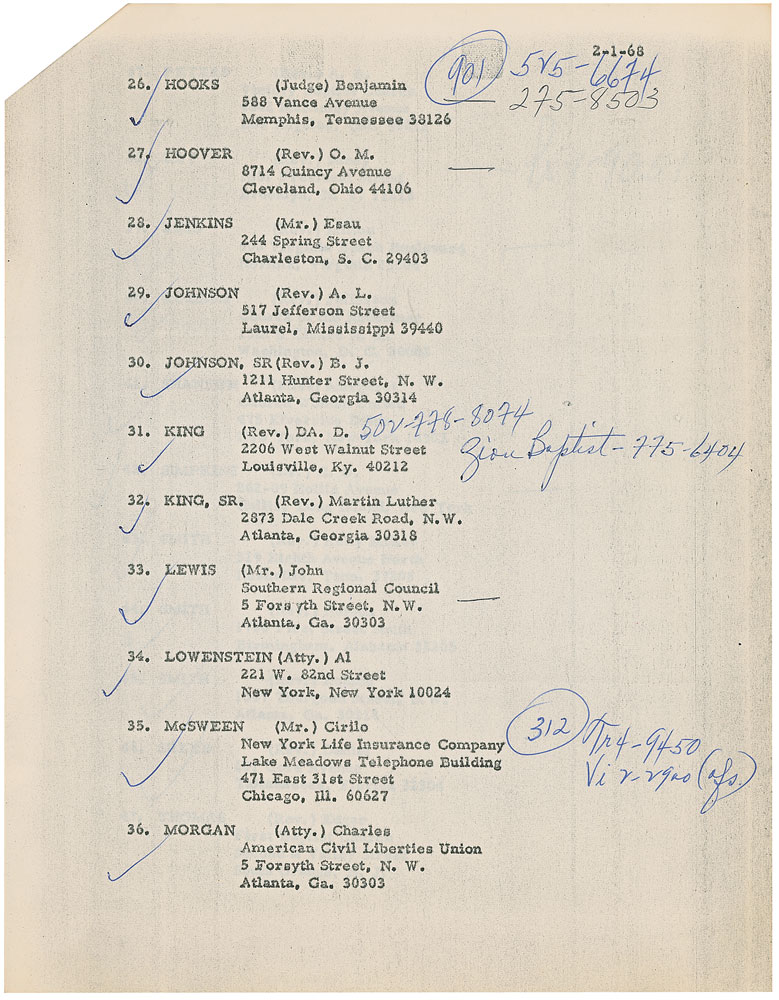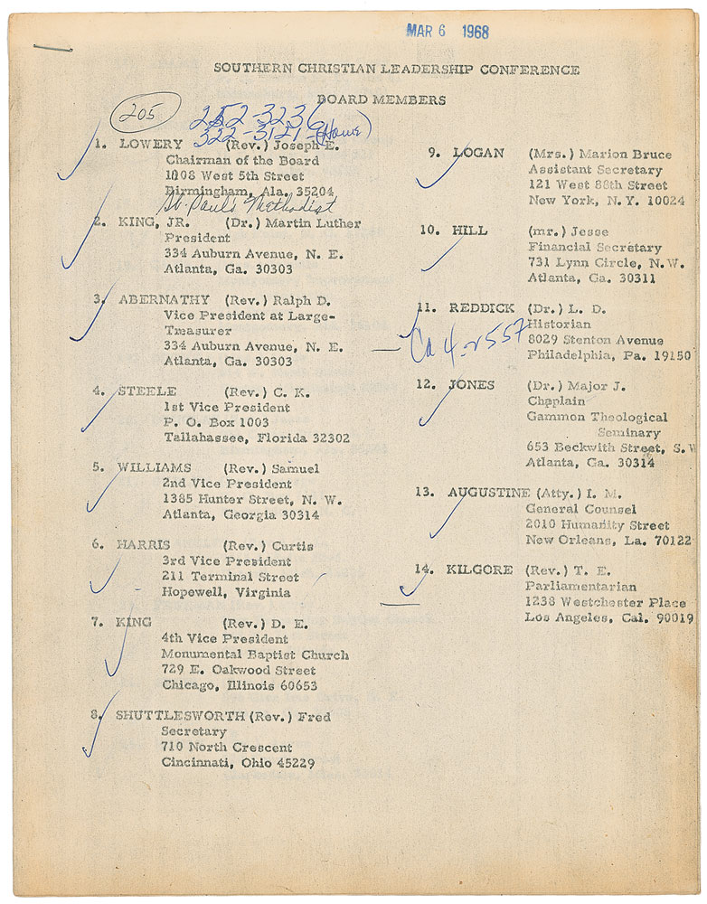 Mimeographed document listing the addresses of board members of the SCLC, five pages, 8.5 x 11, stamp-dated March 6, 1968. Among those listed are Martin Luther King, Jr., Ralph D. Abernathy, Marian Bruce Logan, and John Lewis. The document bears several ballpoint notations and corrections. In fine condition, with overall toning. From the collection of Warren Arthur ‘Chip’ Logan.