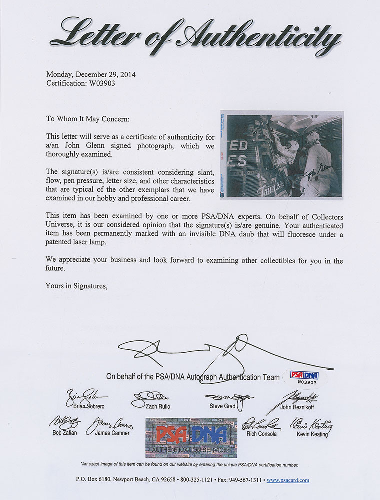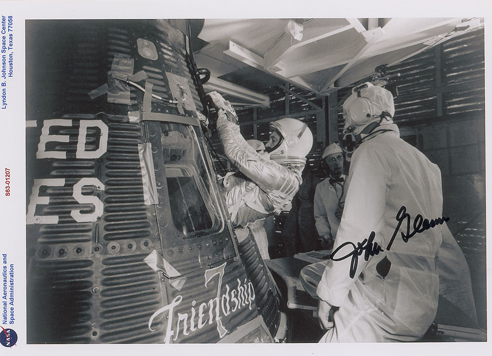 Glossy 10.75 x 8 photo of Glenn climbing inside his Friendship 7 capsule, signed in black felt tip. In fine condition, with a couple trivial creases to left edge. Accompanied by a full letter of authenticity from PSA/DNA.
