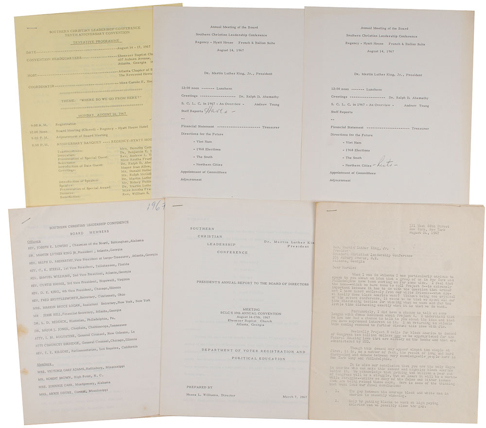 Collection of printed documents concerning the 1967 SCLC Leadership Conference, totaling seventeen pages, including: general and daily schedules; a list of board members; a summary of the annual report to the board of directors; and Marian’s unsigned retained copy of a letter she sent to Martin Luther King, Jr., regarding “Project H,” which concerned affordable housing. In overall very good to fine condition, with a quadrant of the letter clipped out. From the collection of Warren Arthur ‘Chip’ Logan.
