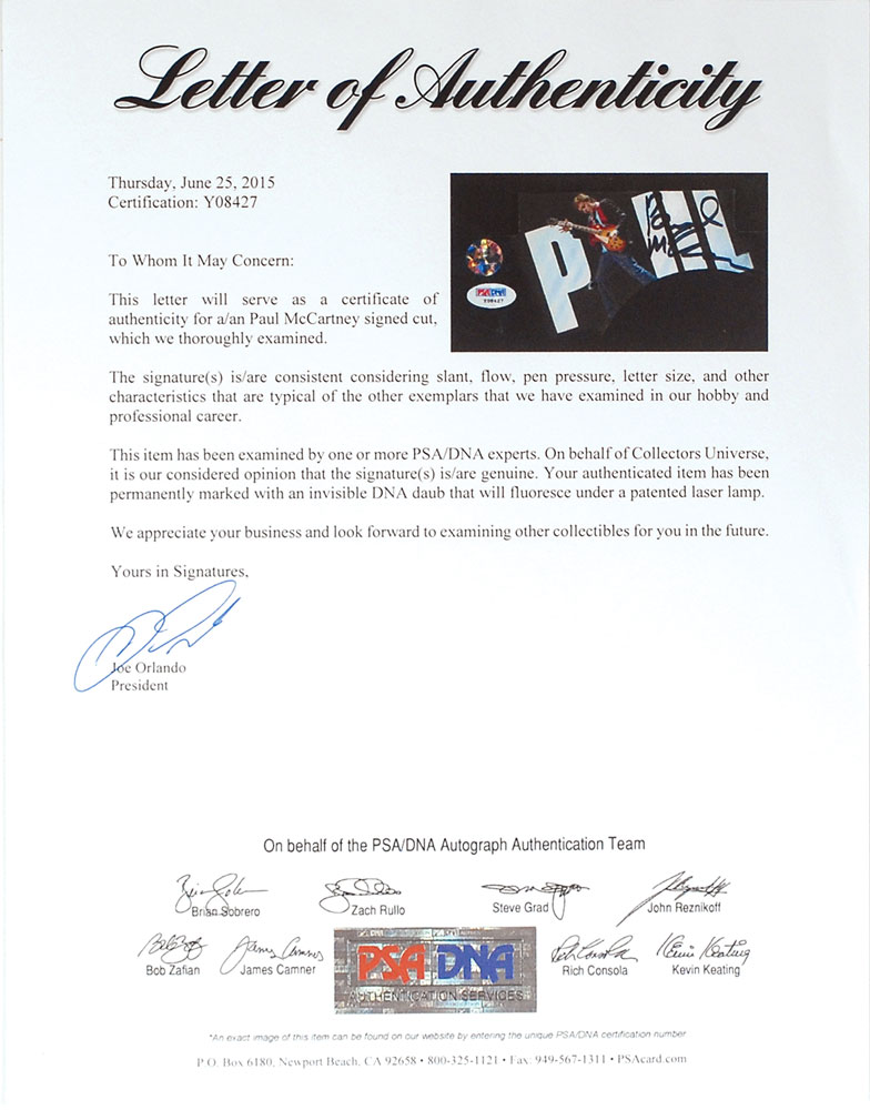 *This item has been pre-certified by a trusted third-party authentication service, and by placing a bid on this item, you agree to accept the opinion of this authentication service. If you wish to have an opinion rendered by a different authenticator of your choosing, you must do so prior to your placing of any bid. RR Auction is not responsible for differing opinions submitted 30 days after the date of the sale.