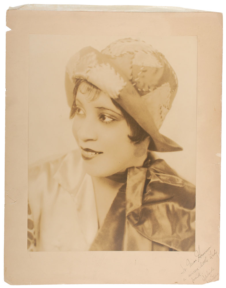 Jazz singer and entertainer (1901–1993) who was a major figure in the Harlem Renaissance and recorded with the likes of Duke Ellington and Fats Waller. Lovely vintage matte-finish 10.25 x 13.25 head-and-shoulders portrait of Hall in a patchwork hat, affixed to an original 13.25 x 16.75 mount, signed and inscribed on the mount in fountain pen, “To Miss Hammon, a sincere little Lady friend, Adelaide of Blackbirds, 1928.” In very good condition, with several chips and small tears to edges (one just below the signature affecting the date). Hall starred on Broadway with Bill ‘Bojangles’ Robinson in Blackbirds of 1928, which became the most successful all-black show ever staged on Broadway and made her a household name. A wonderful oversized portrait inscribed with the title of her breakthrough performance. Pre-certified PSA/DNA.
