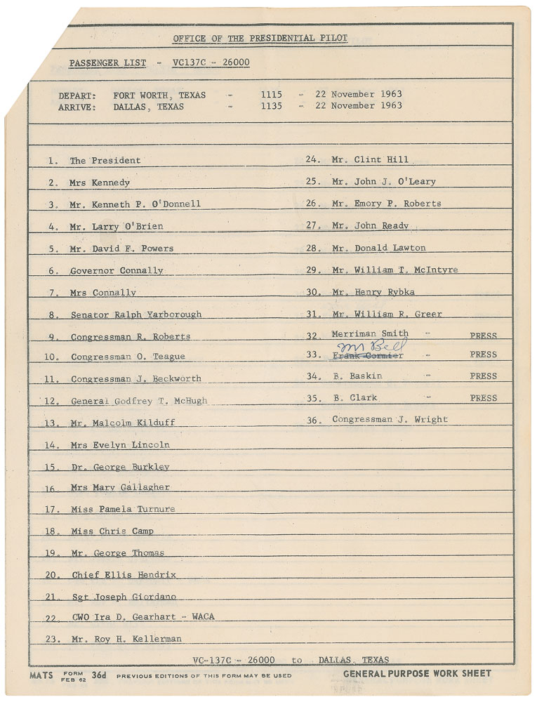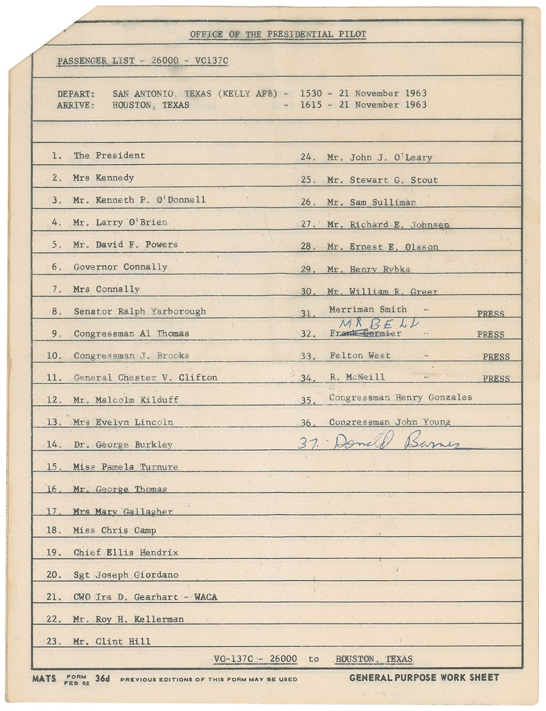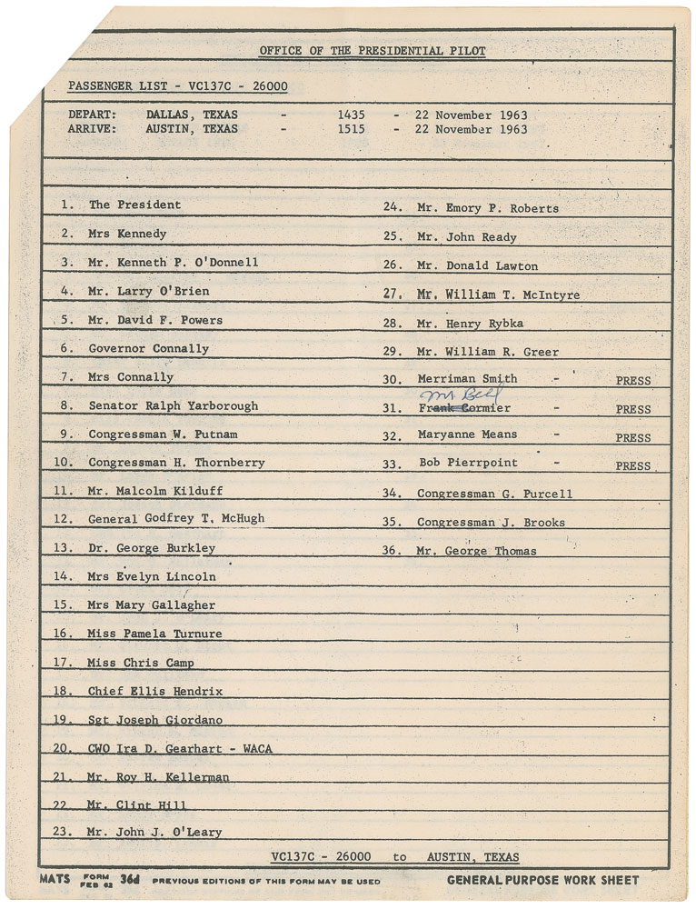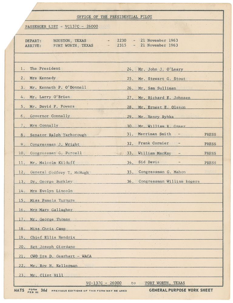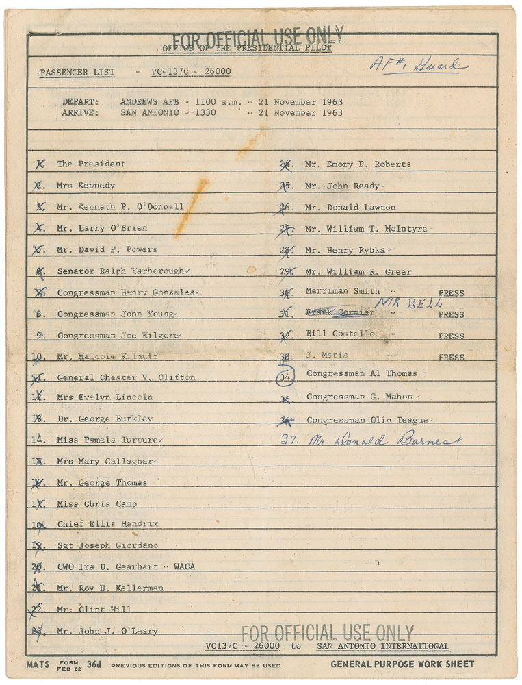 Original passenger manifest from Air Force One for Kennedy’s November 1963 trip to Texas, 8 x 10.5, six pages, November 21, 1963. The first page identifies the plane as “VC-137C - 26000,” is stamped twice, “For Official Use Only,” and bears a ball point notation, “AF #1, Guard.” First page consists of the passenger list for the flight from Andrews Air Force Base to San Antonio on November 21, with especially notable passengers including “The President,” “Mrs Kennedy,” “Mr. David F. Powers,” “Senator Ralph Yarborough,” “Mrs Evelyn Lincoln,” and “Mr. Clint Hill.” This list was evidently used as a checklist to make sure everyone made it aboard. Page two is for their next flight later that day, from San Antonio to Houston, with the notable additions of “Governor Connally” and “Mrs Connally.” Following this is the list of passengers flying from Houston to Fort Worth, set to take off at 10:30 p.m. and land 45 minutes later.
