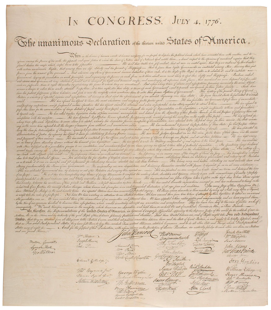 Striking rice paper engraving of the Declaration of Independence, 26 x 29, printed by Peter Force in 1848 for inclusion in his series American Archives, beginning, “In Congress, July 4, 1776. The Unanimous Declaration of the Thirteen United States of America.” Folded as issued and in fine condition, with unobtrusive tear to the upper left (expertly repaired on the reverse), a few trivial spots of staining, and expected mild mirroring of ink. By 1820, the original Declaration of Independence had seriously deteriorated due to inappropriate handling and storage, creating an immediate need for a facsimile reproduction. Commissioned by John Quincy Adams, William J. Stone engraved a copperplate by lifting ink directly from the original and creating a perfect copy. He printed 201 before placing the plate in storage for safekeeping.