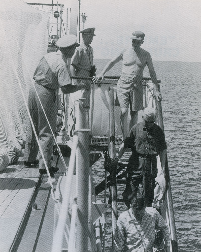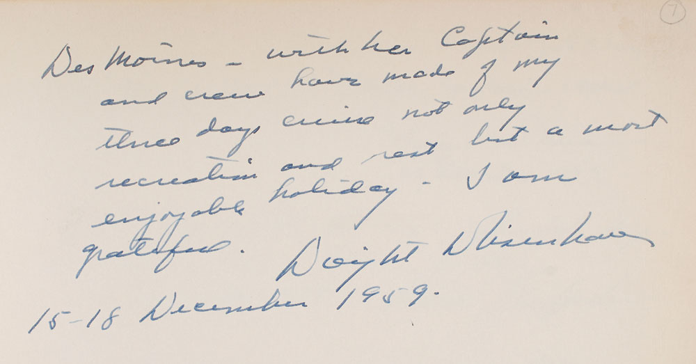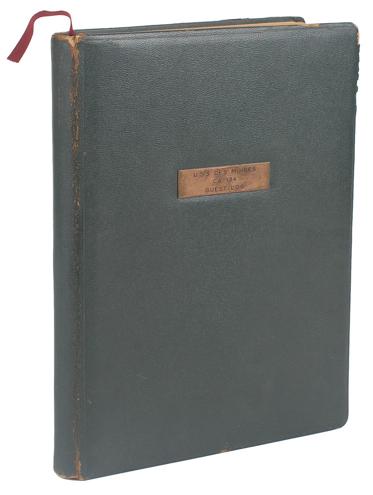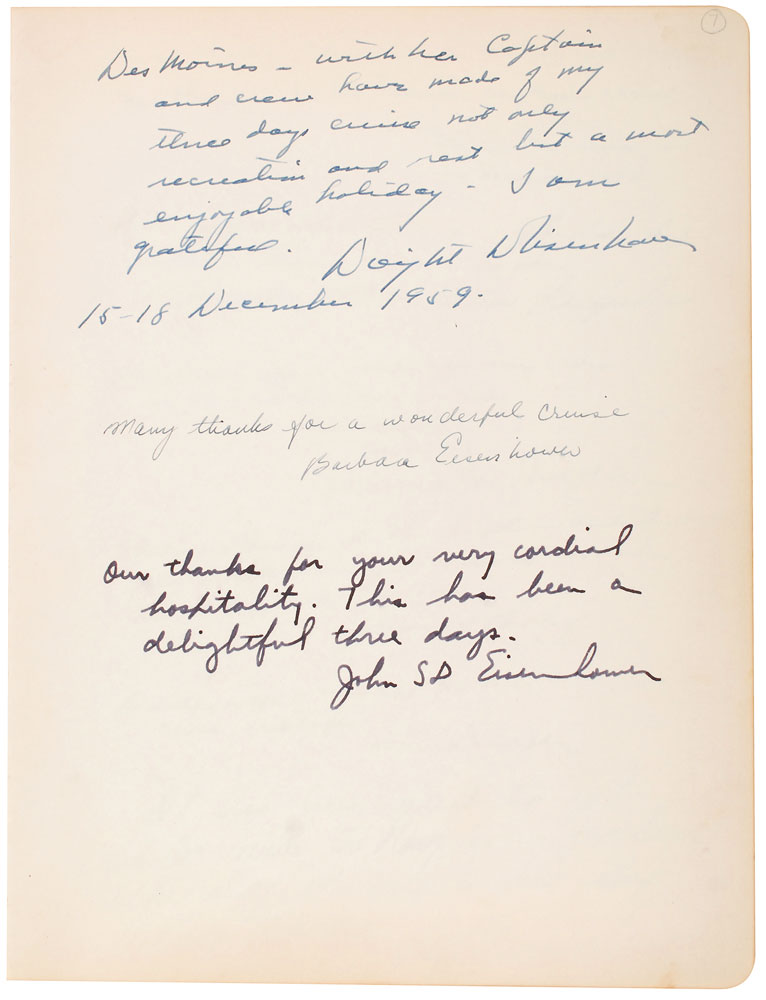 Leather-bound guest log for the U.S.S. Des Moines CA-134, 8.5 x 10.75, signed on the seventh page in fountain pen, "Des Moines-with her captain and crew have made of my three days cruise not only recreation and rest but a most enjoyable holiday-I am grateful. Dwight D. Eisenhower, 15-18 December, 1959." Signed below on the same page by his son and daughter-in-law, John and Barbara. Owned by Captain Charles C. Slayton, the guest log begins on November 25, 1959. Following its decommission in July 1961, the log was used as Clayton's personal guest book until its final entry on August 25, 1973. Filled out on the first 116 pages, the log is signed by hundreds of guests, with several notables that include Emory P. Roberts, James J. Rowley, James Hagerty, W. F. Peterson, and W. R. Shuler, Robert D. Murphy (his calling card is also included). In fine condition, with expected wear to logbook cover; signed page is exceptionally crisp and bold. Accompanied by an unsigned book photo of Eisenhower preparing to descend a staircase on the U.S.S Des Moines, and three correspondence letters between Captain Slayton and the Navy Department.