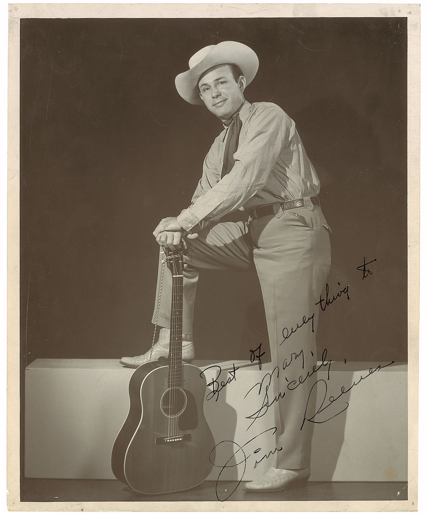 Vintage glossy 8 x 10 full-length photo of Reeves leaning coolly on his guitar, signed and inscribed in fountain pen, “Best of everything to Mary, Sincerely, Jim Reeves.” Tack holes and slight chipping to corners and top and bottom borders, with slight scattered creasing, otherwise fine condition; none of which affect the clear image or bold signature. An exemplary photo of ‘Gentleman Jim,’ one of the foremost practitioners of the Nashville sound. Pre-certified PSA/DNA.