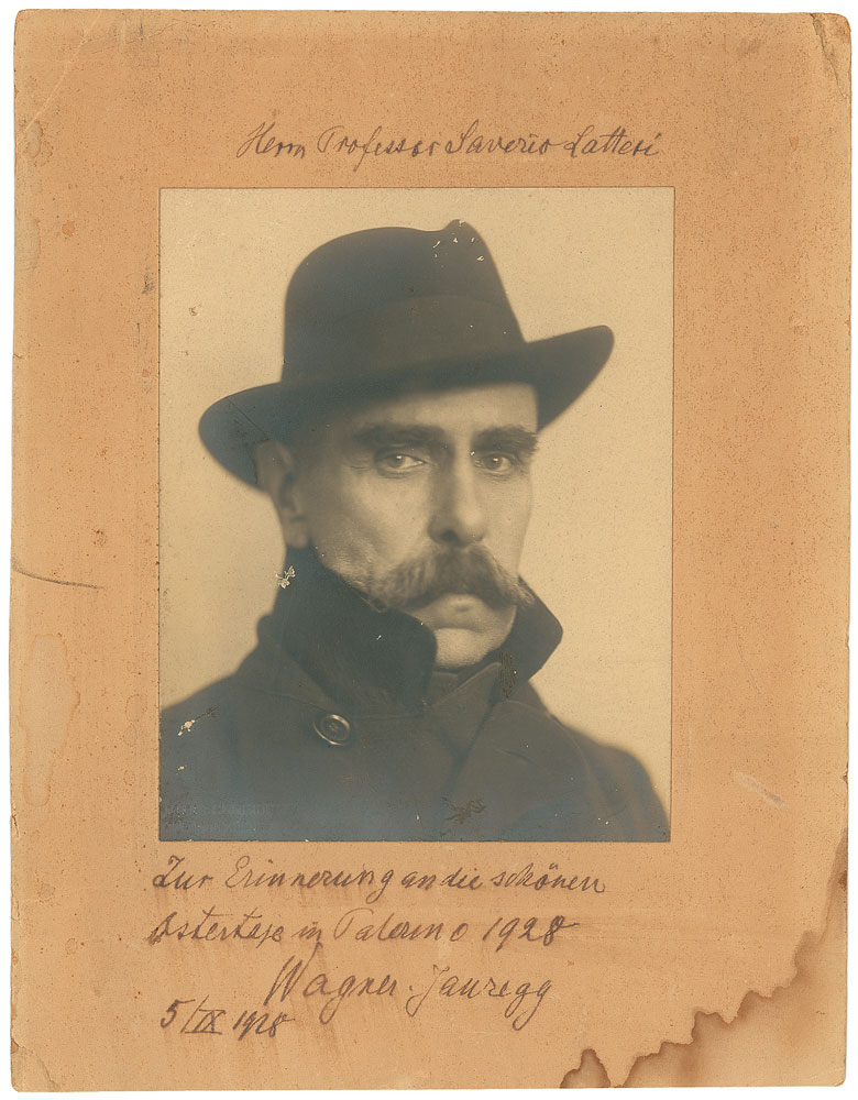 Austrian physician (1857–1940) who won the 1927 Nobel Prize in Medicine for his work in the treatment of mental illness. Matte-finish 4.5 x 6 head-and-shoulders portrait of Wagner-Jauregg, affixed to a 7.5 x 9.75 mount, signed and inscribed on the mount in fountain pen in German, and dated 1928. Photo is blindstamped in the lower left by Max Schneider of Vienna. In very good condition, with dampstaining to lower left, overall brushing to ink, and scattered stains and soiling to mount. Pre-certified PSA/DNA.