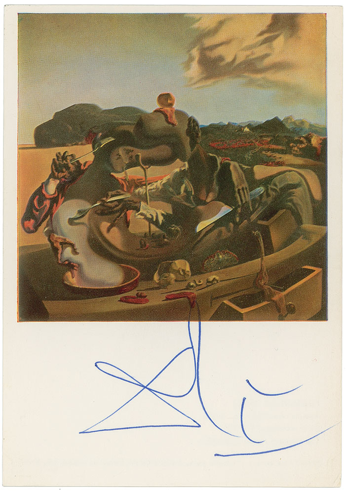 Color postcard of Dali’s 1936 work ‘Autumn Cannibalism,’ 4 x 5.75, prominently signed in the blank lower margin in blue ballpoint. In fine condition, with dings to corner tips. Pre-certified PSA/DNA.