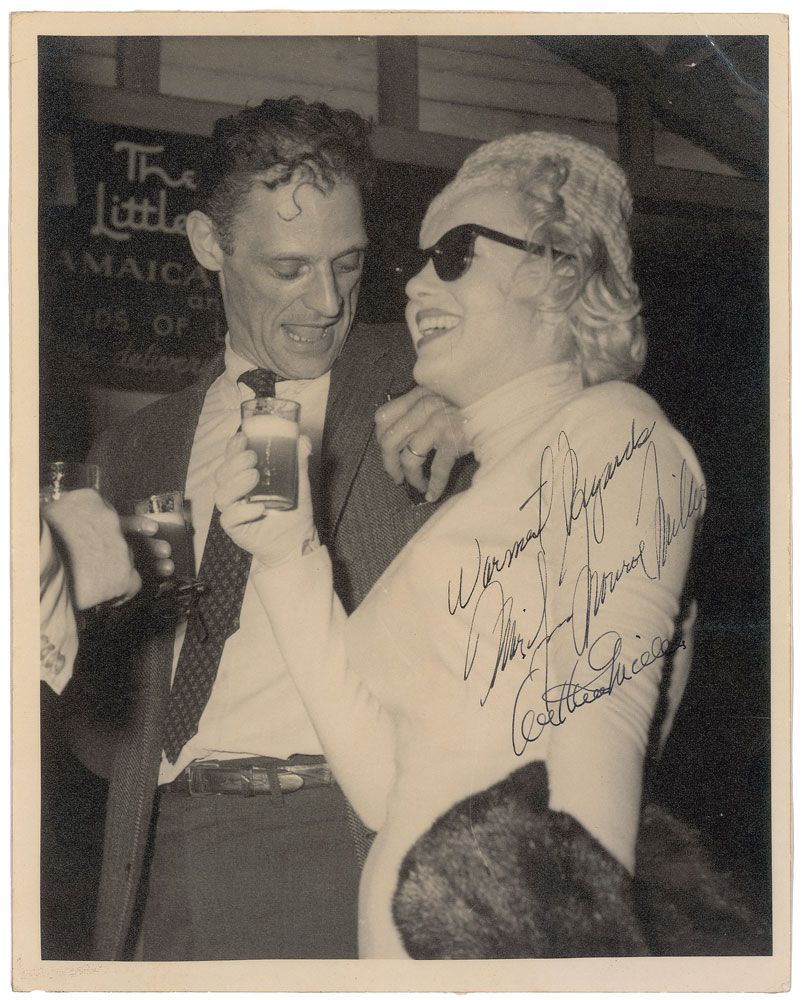 Vintage matte-finish 8 x 10 first-generation candid photo of the newly wed Monroe and Miller during their Jamaican honeymoon in 1957, signed in black ink, “Warmest Regards, Marilyn Monroe Miller” and “Arthur Miller.” Permanently affixed to a same sized scrapbook page. With some minor creasing and silvering confined to edges and corners, not affecting the overall image and bold signatures, otherwise in fine condition.