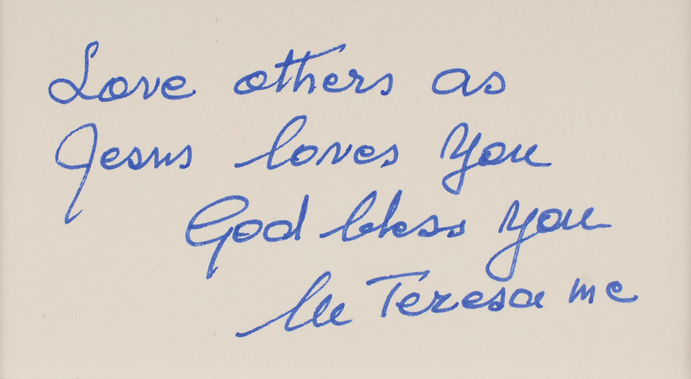 AQS on an off-white 4 x 2.25 card, in full: “Love others as Jesus loves you, God bless you, M. Teresa MC.” Matted with an unsigned portrait to an overall size of 11 x 16. In very fine condition. Pre-certified PSA/DNA.