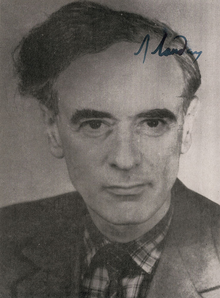 Russian physicist (1908–1968) who won the 1962 Nobel Prize in Physics for his research into ‘superfluidity.’ Uncommon 5 x 6.75 cardstock head-and-shoulders photo, signed in the upper right in black ink, “L. Landau.” In fine condition. Pre-certified PSA/DNA.