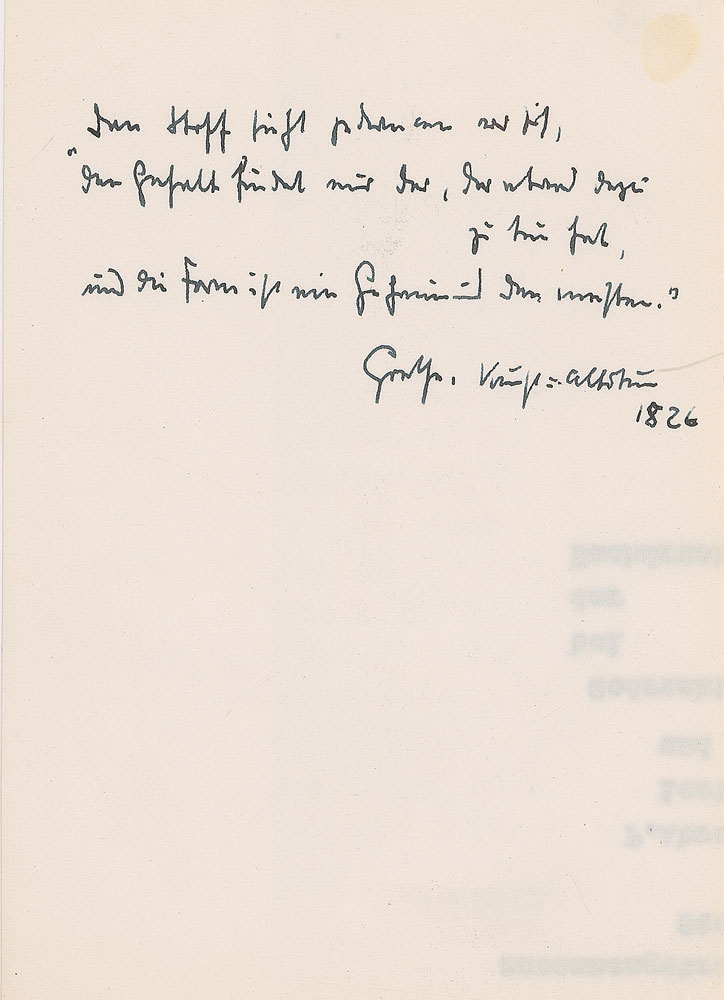 Handwritten quote in German, unsigned, one page, 4 x 5.75, no date. Heidegger pens a quote from Goethe’s Art and Antiquity, in full (translated): “The subject matter is visible to everyone, content is only discovered by him who has something to contribute, and form is a mystery to most.” In fine condition, with a trivial spot of toning to the upper right corner. Pre-certified PSA/DNA.