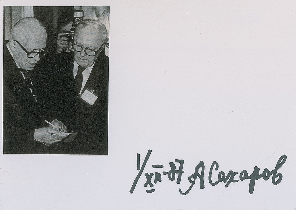 Felt tip signature in Cyrillic on a white 5.75 x 4 card bearing an affixed image of Sakharov. In fine condition. Pre-certified PSA/DNA.