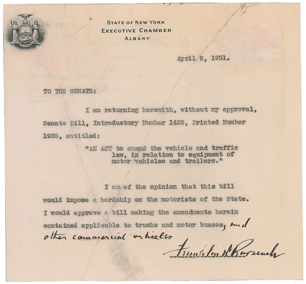 DS, one page, 7.75 x 7.25, April 9, 1931. Veto document issued from the State of New York Executive Chamber during his time as governor, in part: “To the Senate: I am returning herewith, without my approval, Senate Bill…entitled: ‘An Act to amend the vehicle and traffic law, in relation to equipment of motor vehicles and trailers’…This bill would impose a hardship on the motorists of the State. I would approve a bill making the amendments herein contained applicable to trucks and motor busses.” At the conclusion, Roosevelt boldly adds, “And other commercial vehicles.” In very good condition, with scattered soiling, show-through from mounting remnants to upper corners, light pencil office notations through the body of the document, and irregularly trimmed edges. Pre-certified PSA/DNA.