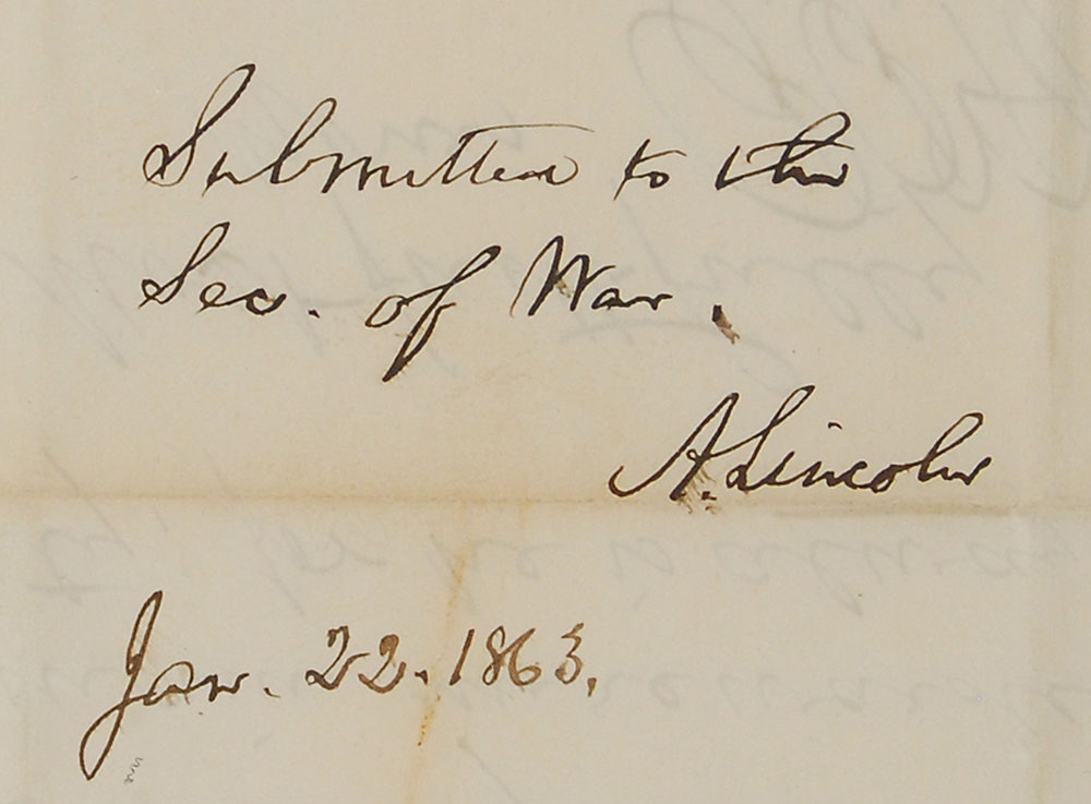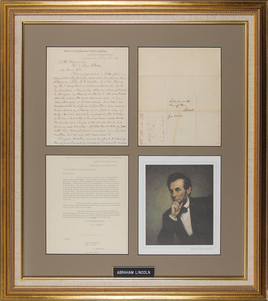 Bold handwritten and signed endorsement as president, "Submitted to the Secretary of War, A. Lincoln, Jan. 23, 1863," penned on the reverse of a letter sent to him by Benjamin Brown French, two pages, 7.75 x 9.5, Office of the Commissioner of Public Buildings letterhead, January 21, 1863. French's letter, in part: "I have just recd. a letter from a very intimate friend, now at Memphis, Tenn. Surgeon John G. F. Holston…I know him to be as accomplished a surgeon as there is in the U. S. He went into service when the war commenced…has been in responsible & difficult positions, has never had a leave of absence or missed a day of duty. He was severely injured in the battles of Iuka & Corinth, & has not been well since…After the battle of Corinth Gen. Grant recommended him for promotion, but he has not received it. Surgeon Holston would be glad to receive the appointment of Medical inspector…I do not believe a better man can be found…My friend Holston was an original Republican, & did excellent service in the cause…I hope he will not remain unrewarded for his untiring duty, for he is always to be relied on." Matted and framed with a color portrait, transcript, and nameplate affixed to the glass to an overall size of 25.75 x 29. In fine condition, with intersecting folds and light toning (a line of toning through the date in Lincoln's endorsement). Oversized.