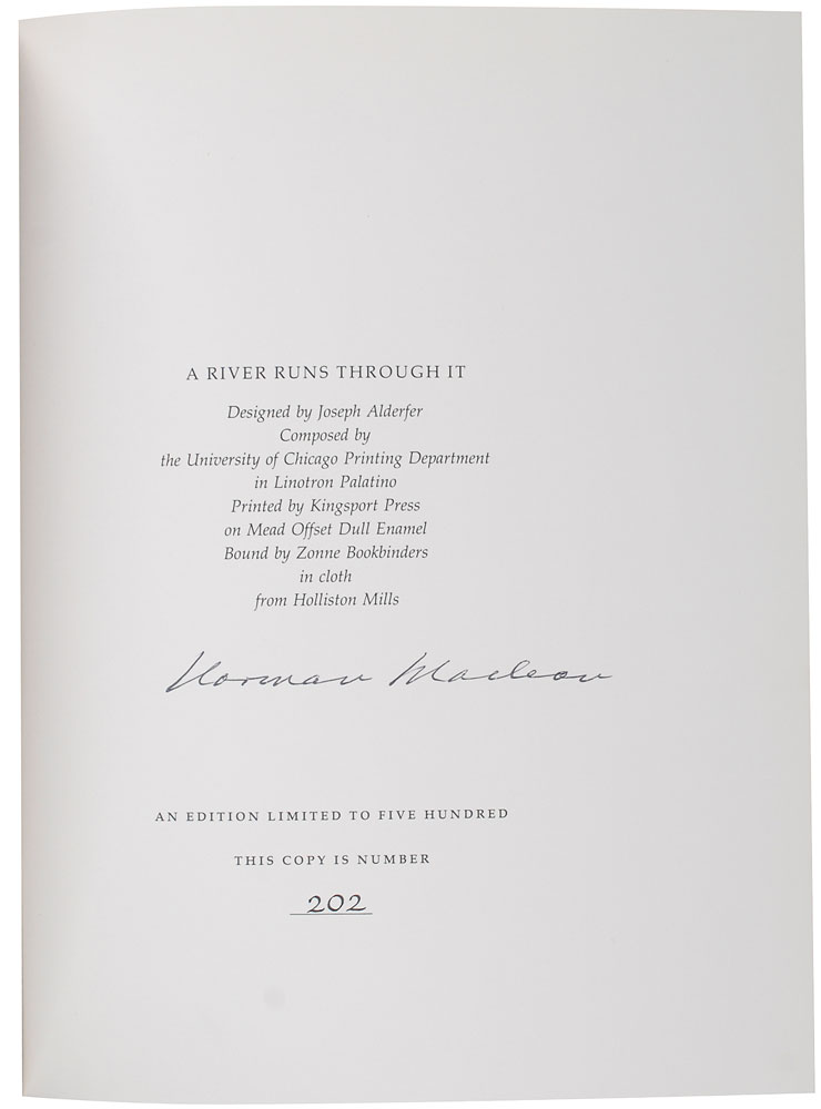Signed book: A River Runs Through It. Later printing, limited issue, numbered 202/500. Chicago: The University of Chicago Press, 1983. Hardcover, 7.25 x 9.25, 124 pages. Signed on the colophon in black ballpoint. In very fine condition. Pre-certified PSA/DNA.