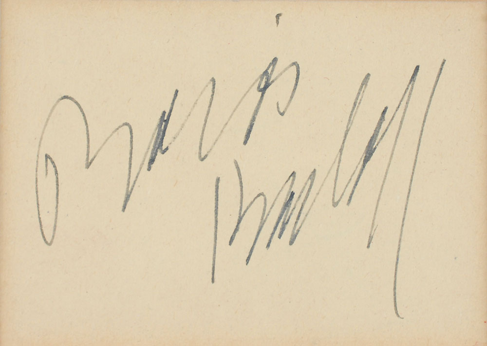 Vintage fountain pen signature, “Boris Karloff,” on an off-white 3.5 x 2.5 slip. Matted and framed with a photo of Karloff to an overall size of 12.5 x 15.5. In fine condition, with uniform toning. Pre-certified PSA/DNA.