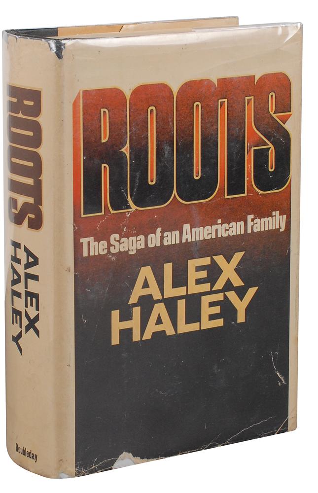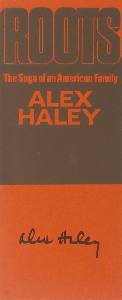 Signed book: Roots. NY: Doubleday, 1976. Hardcover with dust jacket, 5.75 x 8.5, 688 pages. Signed in black felt tip on a bookplate affixed to a free end page. Front dust jacket flap detached but present, and scattered rubbing, creasing, and paper loss to dust jacket, otherwise fine condition.